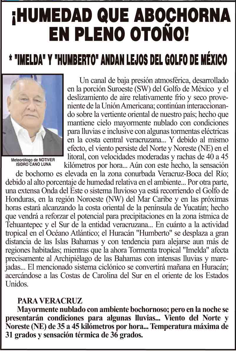 PRIMERA ¡HUMEDAD QUE ABOCHORNA EN PLENO OTOÑO! - *"IMELDA" Y "HUMBERTO" ANDAN LEJOS DEL GOLFO DE MÉXICO 29 septiembre 2025 Más Noticias LA ENCUESTA | - ME ESTÁS OYENDO INÚTIL?... ¡CON BAILONGOS QUIEREN AYUDAR A LOS DAMNIFICADOS DEL NORTE! - *El mismo Alor, toca los timbales ¡YA SE LA APROBARON! - REFORMA PARA LA FISCALÍA ESTATAL NOTI-MEME | - ASÍ ESTUVO EL INFORME... ¡MÁS DE 9 MIL MILLONES! - *Eso costaría cancelar en Veracruz al Grupo MAS ¡LE DAN LUZ VERDE! - DESDE GUATEMALA ¡EL CUARTO! ¡Y COM-PA-RE-CIÓ! - ÁNDALE... ¡NO SE VA LISBETH AURELIA! - *Descarta ir a la Fiscalía y que seguirá como magistrada ¡CREAN EL SÚPER MAÍZ!