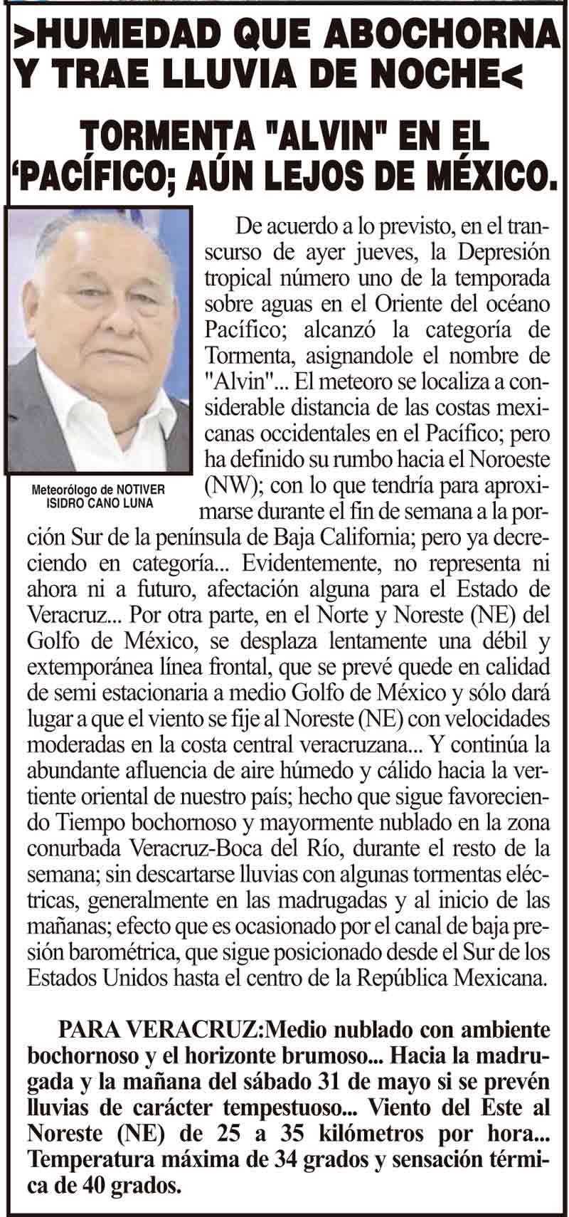 PRIMERA >HUMEDAD QUE ABOCHORNA Y TRAE LLUVIA DE NOCHE< - TORMENTA "ALVIN" EN EL ‘PACÍFICO; AÚN LEJOS DE MÉXICO. 30 mayo 2025 Más Noticias ¡LA PREMIAN EN LA UV! - A SÚPER ESTUDIANTE ¡ACATAN SENTENCIA! - CASO ASCENSIO ¡OPERATIVO “SALVAVIDAS”! ¡TAMBIÉN TAMBORES DE GUERRA! - UYUYYYY ¡VIRGILIO TORRES A TRÁNSITO! - *Era el segundo de Andrés Delgado, en la delegación de Medellín ¡EJECUTAN A LÍDER DE TAXISTAS! - EN ACAYUCAN ¡TIENEN MELLO! - AY NANITAS ¡CUMPLE MANDINGA 425 AÑOS! - *Viene un Príncipe de Camerún NOTI-MEME | - ''LOS GRINCHS'' LOS CARTONES