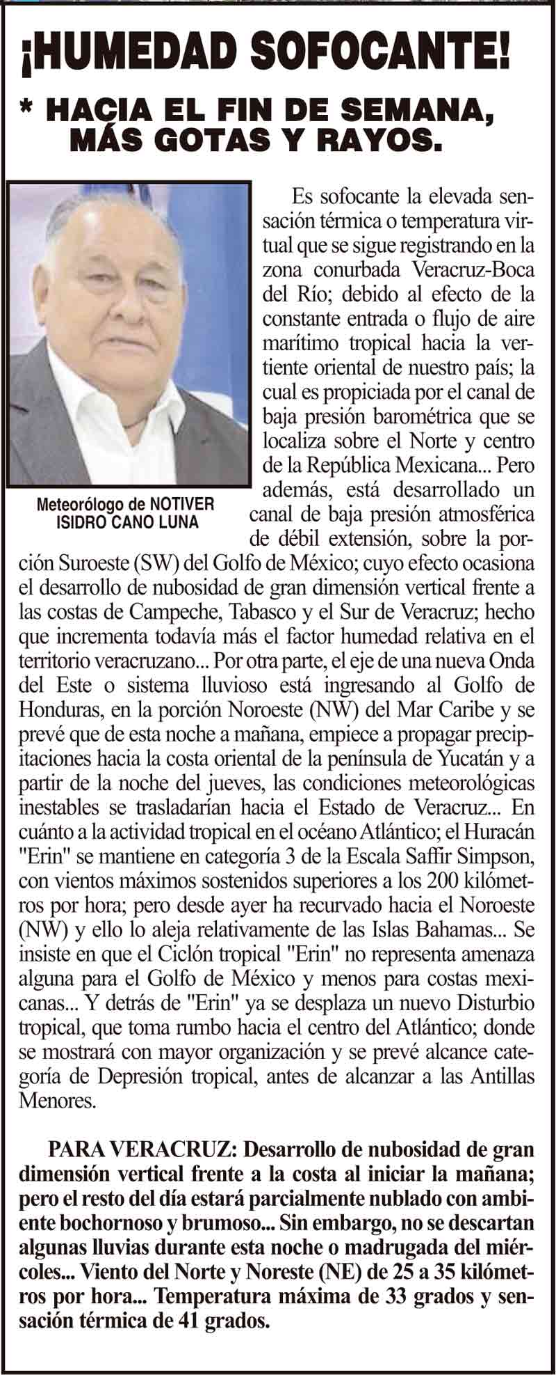 PRIMERA ¡HUMEDAD SOFOCANTE! - *HACIA EL FIN DE SEMANA, MÁS GOTAS Y RAYOS... 19 agosto 2025 Más Noticias ¡YA HAY TERNA! - RAÚL PEIMBERT EN LA LISTA ¡“CEMENTERIO”! - DE ULÚAS ¡INAUGURA PATY OTRA CALLE! ¡NO LE CREYERON! - Y LO BUSCAN NOTI-MEME | - ECOS DEL INFORME! ¡VERÓNICA VA CON NAHLE! - Y AL CONGRESO ¡“FAST TRACK”! - *Mientras el Mariner salía y entraba de Pajaritos en Coatzacoalcos ¡OPERATIVO LUPE-REYES! ¡MANDAN LA BILLETIZA! - *Corea manda 150 mil dólares ¡CRISTINA GANA LA ELECCIÓN!