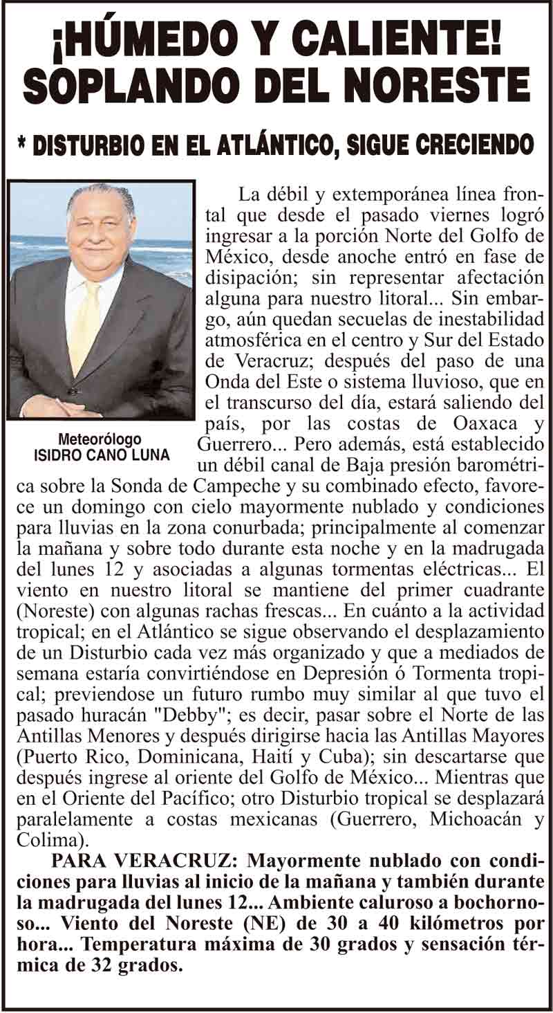 PRIMERA ¡HÚMEDO Y CALIENTE! SOPLANDO DEL NORESTE - *DISTURBIO EN EL ATLÁNTICO, SIGUE CRECIENDO 11 agosto 2024 Más Noticias ¡YA HAY TERNA! - RAÚL PEIMBERT EN LA LISTA ¡“CEMENTERIO”! - DE ULÚAS ¡INAUGURA PATY OTRA CALLE! ¡NO LE CREYERON! - Y LO BUSCAN NOTI-MEME | - ECOS DEL INFORME! ¡VERÓNICA VA CON NAHLE! - Y AL CONGRESO ¡“FAST TRACK”! - *Mientras el Mariner salía y entraba de Pajaritos en Coatzacoalcos ¡OPERATIVO LUPE-REYES! ¡MANDAN LA BILLETIZA! - *Corea manda 150 mil dólares ¡CRISTINA GANA LA ELECCIÓN!