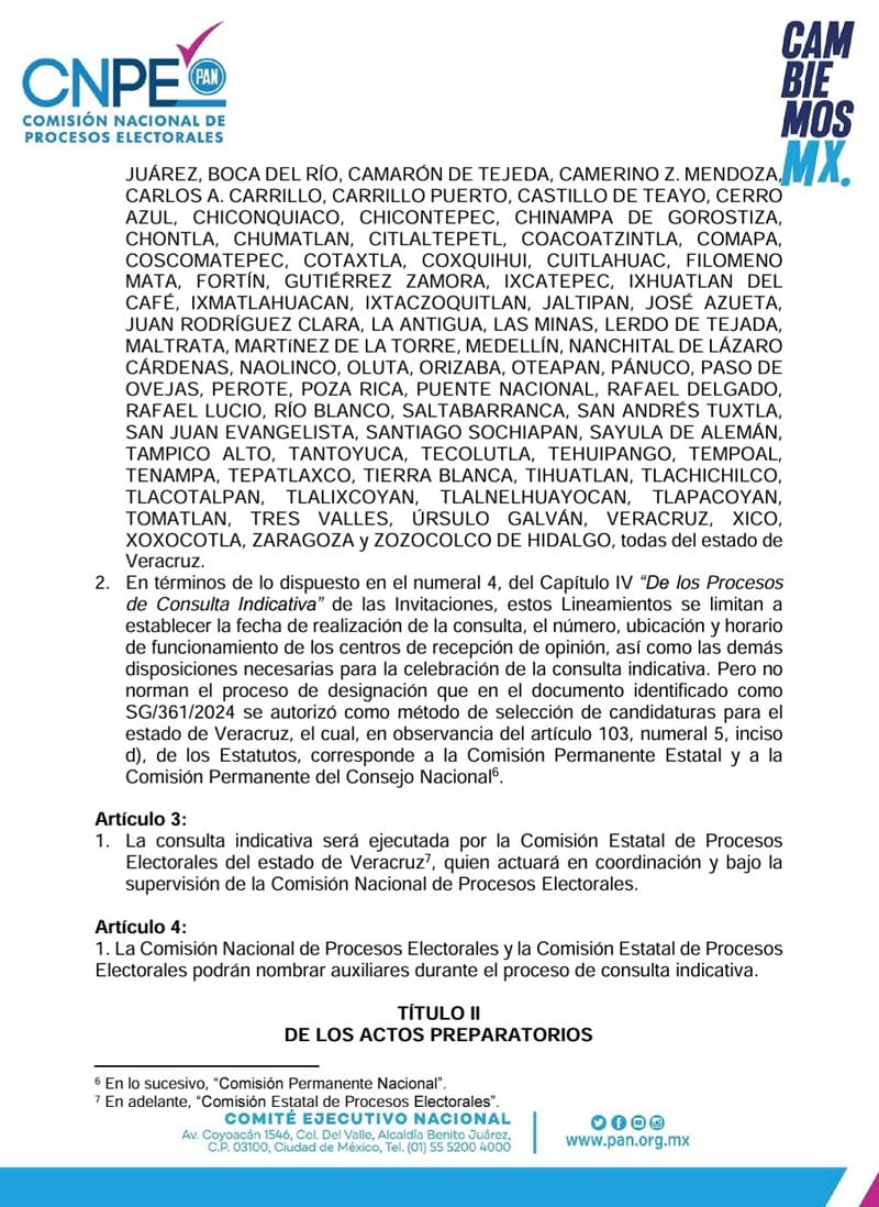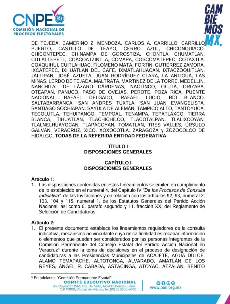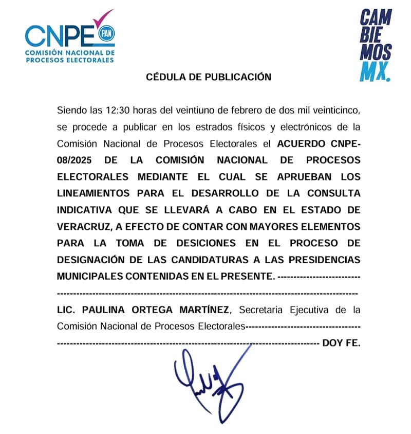 El Partido Acción Nacional (PAN) a través de la Comisión Nacional de Procesos Electorales, publicó en sus estrados físicos y electrónicos el Acuerdo mediante, el cual se aprueban los lineamientos para el desarrollo de la Consulta Indicativa que se llevará a cabo en el estado de Veracruz, con el propósito de contar con mayores elementos para la toma de desiciones en el proceso de designación de candidaturas a alcaldías por el PAN en los 212 municipios veracruzanos.