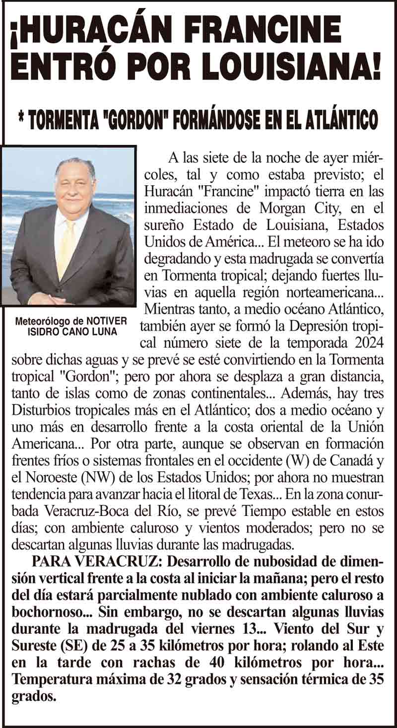 PRIMERA ¡HURACÁN FRANCINE ENTRÓ POR LOUISIANA! - *TORMENTA "GORDON" FORMÁNDOSE EN EL ATLÁNTICO 12 septiembre 2024 Más Noticias ¡YA HAY TERNA! - RAÚL PEIMBERT EN LA LISTA ¡“CEMENTERIO”! - DE ULÚAS ¡INAUGURA PATY OTRA CALLE! ¡NO LE CREYERON! - Y LO BUSCAN NOTI-MEME | - ECOS DEL INFORME! ¡VERÓNICA VA CON NAHLE! - Y AL CONGRESO ¡“FAST TRACK”! - *Mientras el Mariner salía y entraba de Pajaritos en Coatzacoalcos ¡OPERATIVO LUPE-REYES! ¡MANDAN LA BILLETIZA! - *Corea manda 150 mil dólares ¡CRISTINA GANA LA ELECCIÓN!