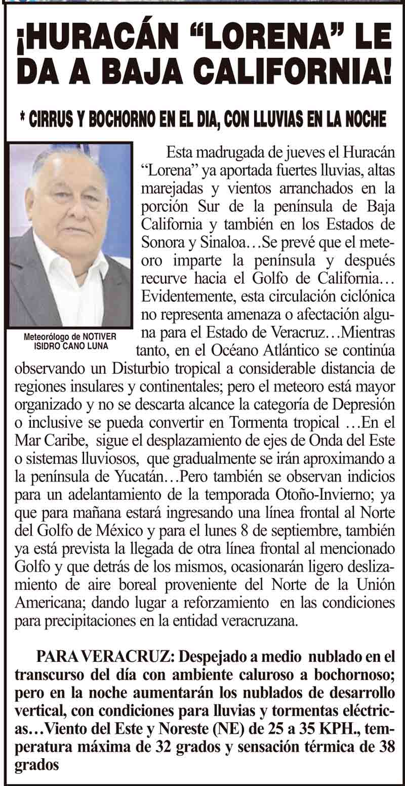 PRIMERA ¡HURACÁN “LORENA” LE DA A BAJA CALIFORNIA! - *CIRRUS Y BOCHORNO EN EL DIA, CON LLUVIAS EN LA NOCHE 4 septiembre 2025 Más Noticias LA PORTADA - VIERNES 5 DE DICIEMBRE 2025 ¡HOY SOPLA FRESCO Y DE FRENTE! - *PERO EL LUNES 8, ESTARÁ FUERTE Y CON LLUVIAS. LA ENCUESTA | - ME ESTÁS OYENDO INÚTIL?... ¡CON BAILONGOS QUIEREN AYUDAR A LOS DAMNIFICADOS DEL NORTE! - *El mismo Alor, toca los timbales ¡YA SE LA APROBARON! - REFORMA PARA LA FISCALÍA ESTATAL NOTI-MEME | - ASÍ ESTUVO EL INFORME... ¡MÁS DE 9 MIL MILLONES! - *Eso costaría cancelar en Veracruz al Grupo MAS ¡LE DAN LUZ VERDE! - DESDE GUATEMALA ¡EL CUARTO! ¡Y COM-PA-RE-CIÓ! - ÁNDALE...