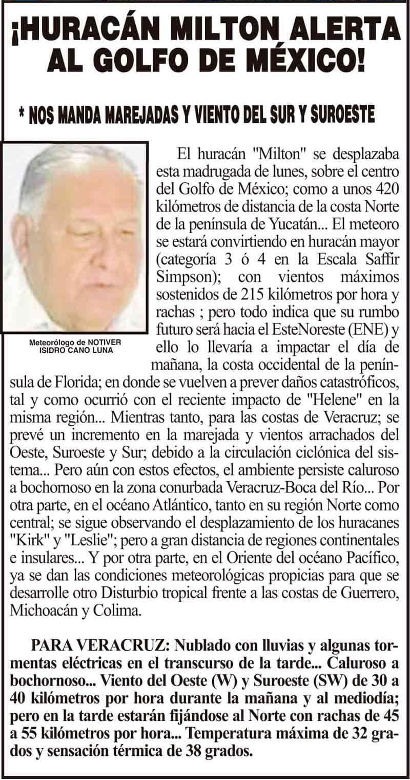 PRIMERA ¡HURACÁN MILTON ALERTA AL GOLFO DE MÉXICO! - *NOS MANDA MAREJADAS Y VIENTO DEL SUR Y SUROESTE 7 octubre 2024 Más Noticias ¡YA HAY TERNA! - RAÚL PEIMBERT EN LA LISTA ¡“CEMENTERIO”! - DE ULÚAS ¡INAUGURA PATY OTRA CALLE! ¡NO LE CREYERON! - Y LO BUSCAN NOTI-MEME | - ECOS DEL INFORME! ¡VERÓNICA VA CON NAHLE! - Y AL CONGRESO ¡“FAST TRACK”! - *Mientras el Mariner salía y entraba de Pajaritos en Coatzacoalcos ¡OPERATIVO LUPE-REYES! ¡MANDAN LA BILLETIZA! - *Corea manda 150 mil dólares ¡CRISTINA GANA LA ELECCIÓN!