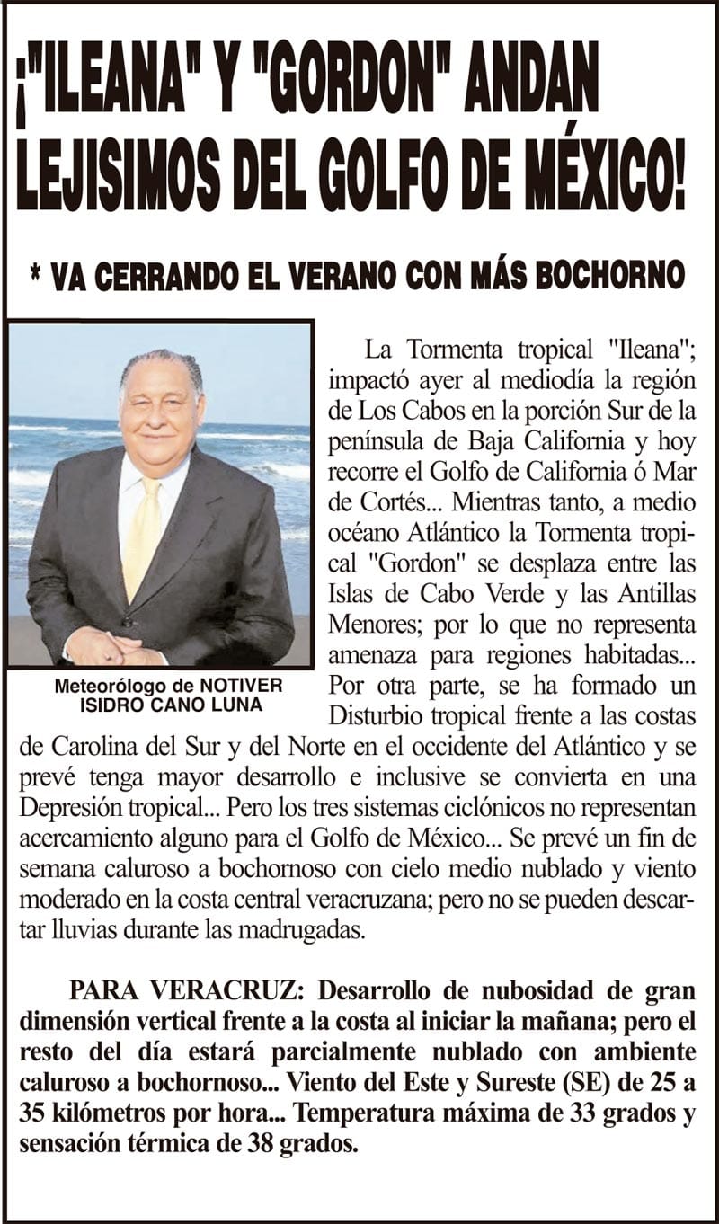 PRIMERA ¡"ILEANA" Y "GORDON" ANDAN LEJISIMOS DEL GOLFO DE MÉXICO! - *VA CERRANDO EL VERANO CON MÁS BOCHORNO 14 septiembre 2024 Más Noticias ¡YA HAY TERNA! - RAÚL PEIMBERT EN LA LISTA ¡“CEMENTERIO”! - DE ULÚAS ¡INAUGURA PATY OTRA CALLE! ¡NO LE CREYERON! - Y LO BUSCAN NOTI-MEME | - ECOS DEL INFORME! ¡VERÓNICA VA CON NAHLE! - Y AL CONGRESO ¡“FAST TRACK”! - *Mientras el Mariner salía y entraba de Pajaritos en Coatzacoalcos ¡OPERATIVO LUPE-REYES! ¡MANDAN LA BILLETIZA! - *Corea manda 150 mil dólares ¡CRISTINA GANA LA ELECCIÓN!
