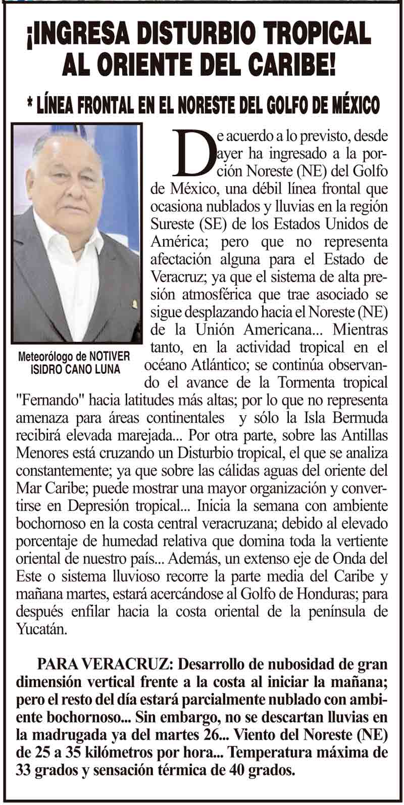 PRIMERA ¡INGRESA DISTURBIO TROPICAL AL ORIENTE DEL CARIBE! - *LÍNEA FRONTAL EN EL NORESTE DEL GOLFO DE MÉXICO 25 agosto 2025 Más Noticias ¡HOY SOPLA FRESCO Y DE FRENTE! - *PERO EL LUNES 8, ESTARÁ FUERTE Y CON LLUVIAS. LA ENCUESTA | - ME ESTÁS OYENDO INÚTIL?... ¡CON BAILONGOS QUIEREN AYUDAR A LOS DAMNIFICADOS DEL NORTE! - *El mismo Alor, toca los timbales ¡YA SE LA APROBARON! - REFORMA PARA LA FISCALÍA ESTATAL NOTI-MEME | - ASÍ ESTUVO EL INFORME... ¡MÁS DE 9 MIL MILLONES! - *Eso costaría cancelar en Veracruz al Grupo MAS ¡LE DAN LUZ VERDE! - DESDE GUATEMALA ¡EL CUARTO! ¡Y COM-PA-RE-CIÓ! - ÁNDALE... ¡NO SE VA LISBETH AURELIA! - *Descarta ir a la Fiscalía y que seguirá como magistrada