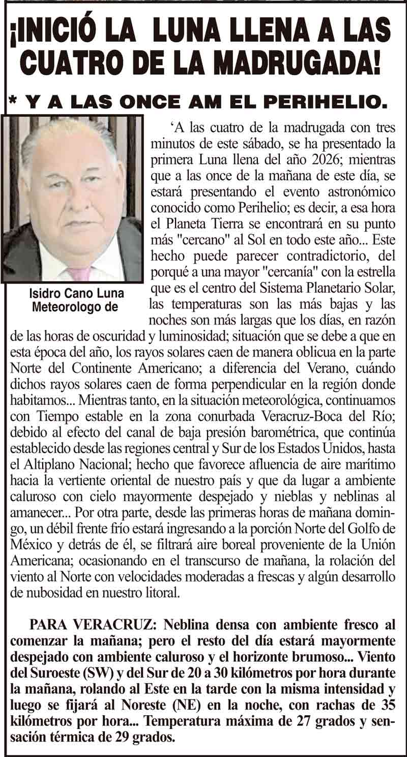 PRIMERA ¡INICIÓ LA LUNA LLENA A LAS CUATRO DE LA MADRUGADA! - *Y A LAS ONCE AM EL PERIHELIO. 3 enero 2026 Más Noticias ¡YA NO LO CUIDABAN! - A CARLOS ¡ALERTA GRIS EN BOCA! - *Maryjose ordena a la Fuerza de Tarea Municipal permanecer en alerta permanente ¡AGUAS CON LOS VIRUS! - *Se disparan las gripas ¡MUERE COCO COUSILLAS! - GRAN VERACRUZANO ¡RENUNCIA EDUARDO CORONEL! - *Eloy Carlos Flores ya rindió protesta ¡EXIGEN JUSTICIA! - ORGANIZACIONES DE PERIODISTAS ¡OTRO BARCO PETROLERO! ¡VENDEN COMO CHATARRA UN TOYOTA! ¡SE ARRANCAN! - PROCESO EXTRAORDINARIO DE TAMIAHUA ¡PERIODISTA TUVO ALTERCADO CON POLICÍAS!