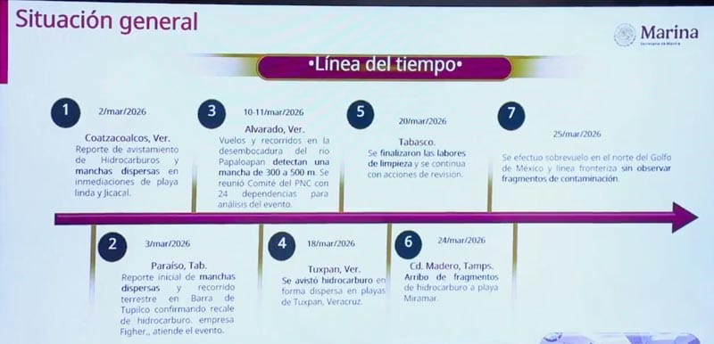 La Secretaría de Marina determinó que el derrame de hidrocarburos que afecta las costas de Veracruz y el Golfo de México se originó por tres fuentes principales, un buque localizado en las inmediaciones de Coatzacoalcos, en la zona de fondeo, el cual es señalado como la fuente antropogénica del vertido y un par de chapopoteras naturales.