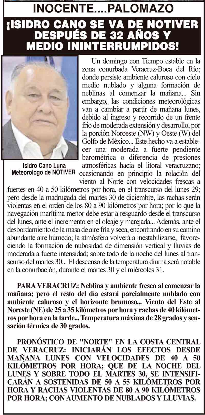 PRIMERA ¡ISIDRO CANO SE VA DE NOTIVER DESPUÉS DE 32 AÑOS Y MEDIO ININTERRUMPIDOS! - INOCENTE.... PALOMAZO 28 diciembre 2025 Más Noticias LA PORTADA - DOMINGO 28 DE DICIEMBRE 2025 ¡NOS INVADEN LOS BICHOS! ¡“PARA LA LEY TODOS SOMOS IGUALES”! - NAHLE ¡SE LLEVAN EL ORO DEL MONTEPÍO! - *Resguardan prendas no vencidas ¡COMIENZAN A DESOCUPAR EL PALACIO! ¡SOS EN ZONTECOMATLÁN! - POR LA “CARRETERA DE LA MUERTE” LA ENCUESTA | - OILA! ¡VERACRUZ EN LA LISTA DE TOMAS CLANDESTINAS DE HIDROCARBUROS! ¡SACAN LA LISTA! - *De aspirantes a dirigir la CEDH ¡APARECEN LUCES ROJAS! - AY NANITAS
