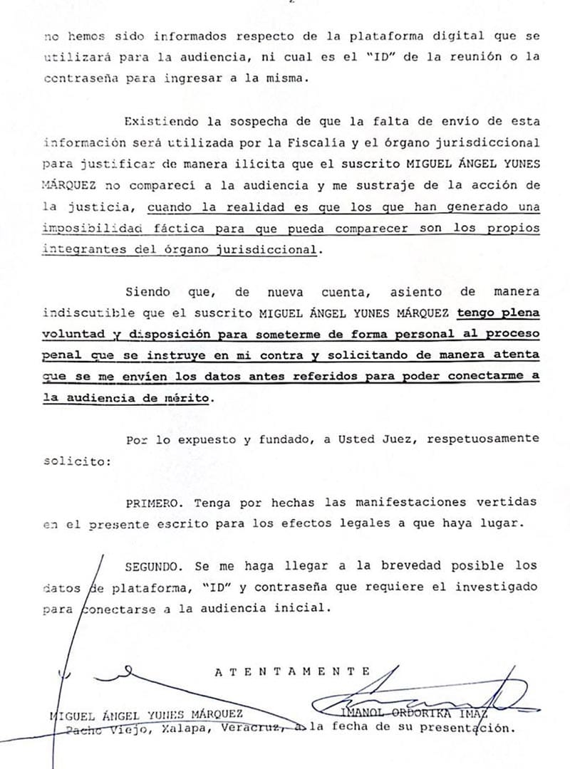 “tengo plena voluntad y disposición para someterme de forma personal al proceso penal que se instruye en mi contra… solicitando de manera atenta que se me envíen los datos antes referidos para poder conectarme a la audiencia de mérito”.