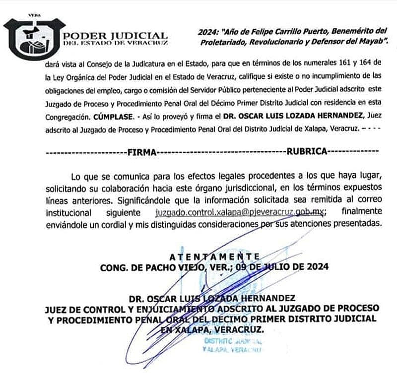 El requerimiento lo hace el doctor Oscar Luis Lozada Hernández, juez de control, enjuiciamiento adscrito al juzgado de proceso y procedimiento penal oral del décimo primer distrito judicial de Xalapa, Veracruz.
