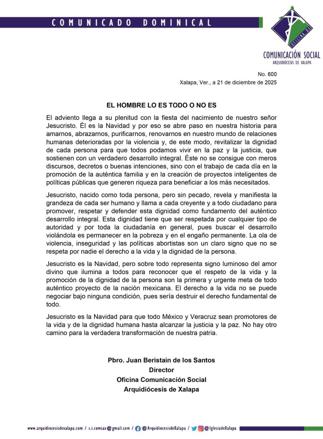Xalapa, Ver. (Agencias).- El arzobispo de Xalapa, Jorge Carlos Patrón Wong, afirmó que la sociedad requiere una justicia inspirada por Dios y no por intereses humanos, al emitir su mensaje dominical con motivo del último domingo de Adviento.