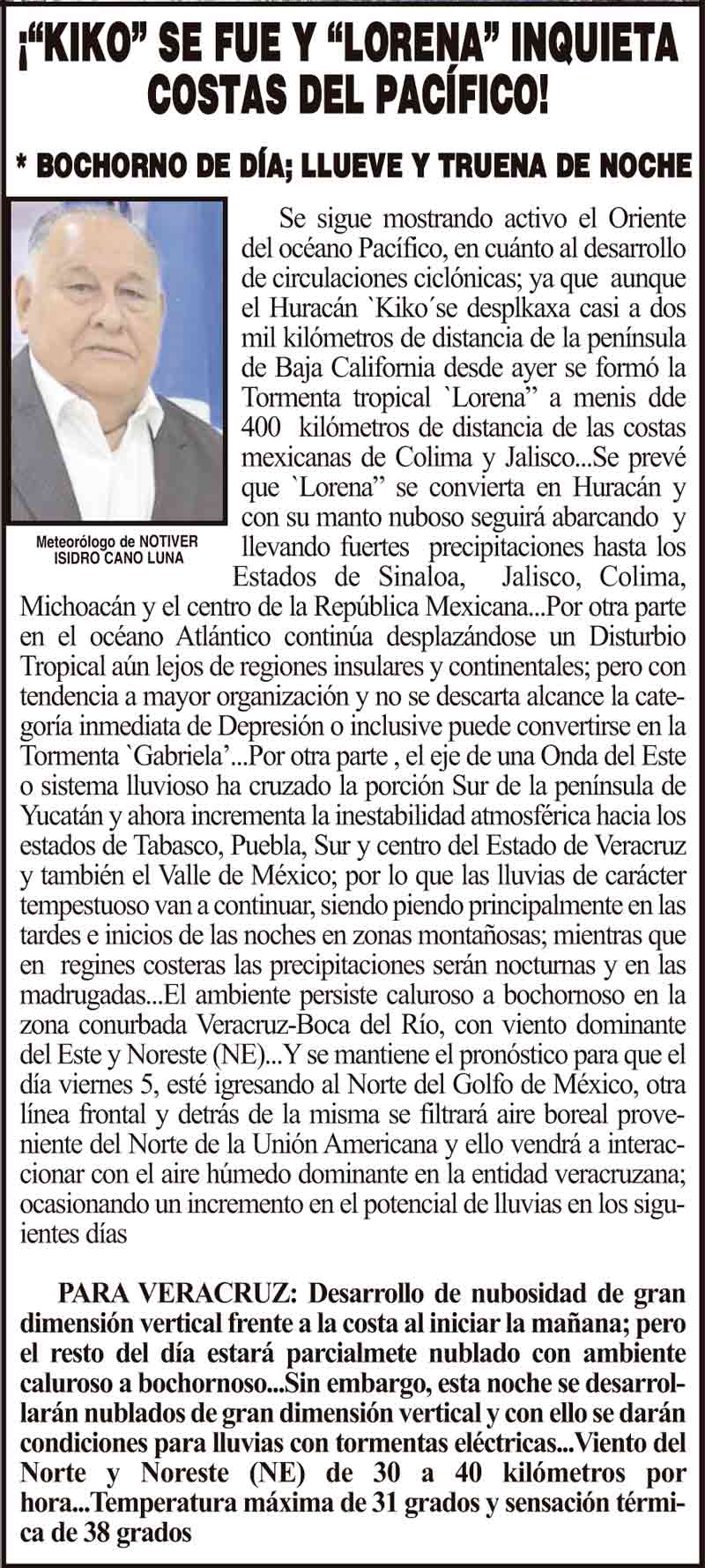 PRIMERA ¡“KIKO” SE FUE Y “LORENA” INQUIETA COSTAS DEL PACÍFICO! - *BOCHORNO DE DÍA; LLUEVE Y TRUENA DE NOCHE 3 septiembre 2025 Más Noticias ¡YA HAY TERNA! - RAÚL PEIMBERT EN LA LISTA ¡“CEMENTERIO”! - DE ULÚAS ¡INAUGURA PATY OTRA CALLE! ¡NO LE CREYERON! - Y LO BUSCAN NOTI-MEME | - ECOS DEL INFORME! ¡VERÓNICA VA CON NAHLE! - Y AL CONGRESO ¡“FAST TRACK”! - *Mientras el Mariner salía y entraba de Pajaritos en Coatzacoalcos ¡OPERATIVO LUPE-REYES! ¡MANDAN LA BILLETIZA! - *Corea manda 150 mil dólares ¡CRISTINA GANA LA ELECCIÓN!