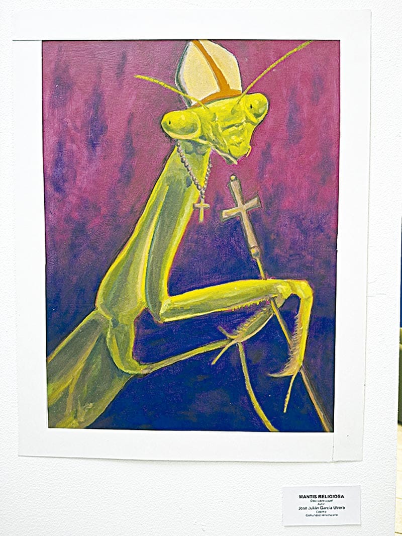 MANTIS RELIGIOSA. Es el título de una de las obras expuestas, en la Universidad Cristóbal Colón, por José Julián García Utrera, quien es becario externo en el taller libre de dibujo en esta institución.
