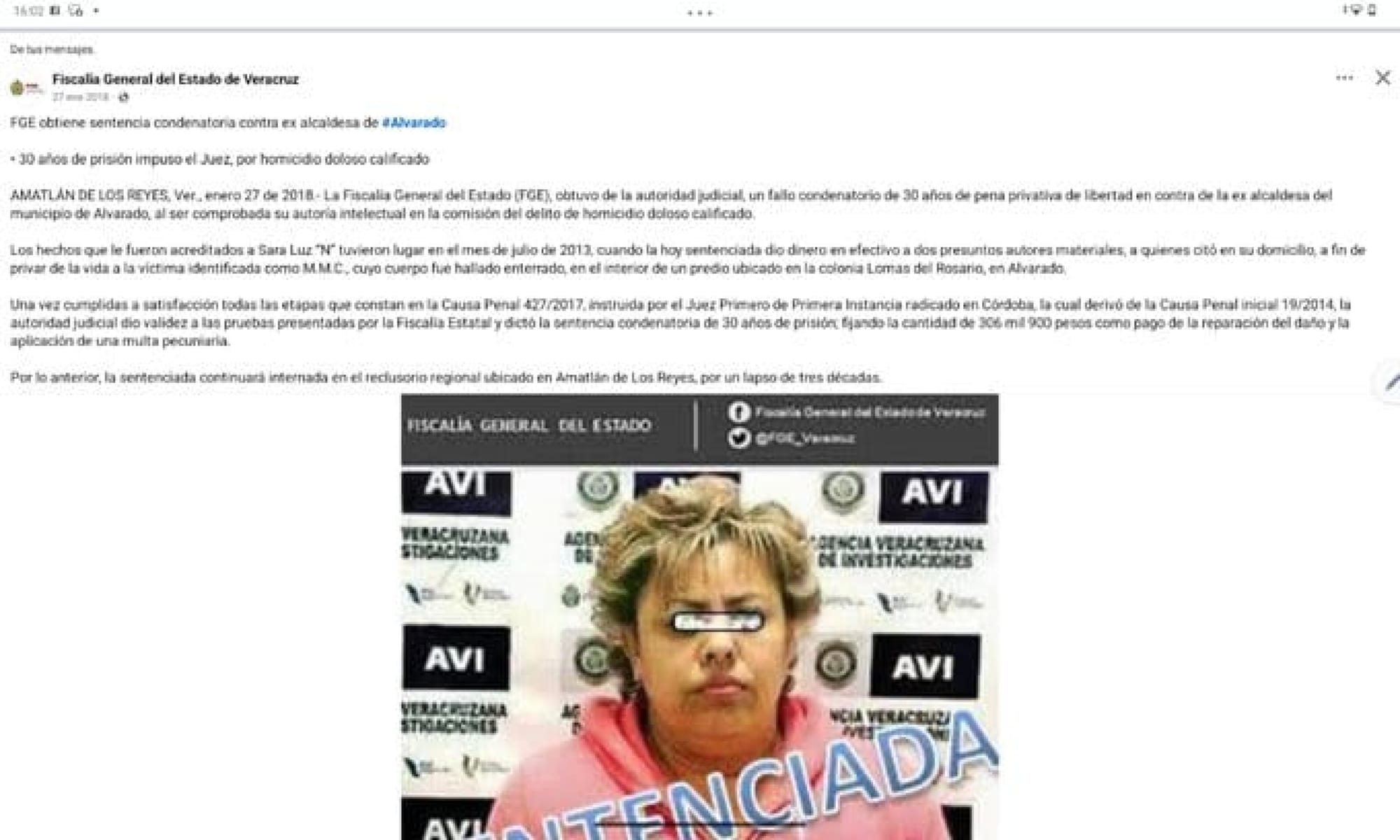 La Fiscalía del Estado, informó que la ex alcaldesa fue acusada por los hechos cometidos en agravio de la víctima identificada con las iniciales M.M.C., quien se desempeñaba como su secretario particular, y cuyo cuerpo sin vida fuera hallado el 3 de agosto del 2013 en la colonia Lomas del Rosario, del municipio de Alvarado, tras haber sido privado de la vida por órdenes de Sara Luz “N”.