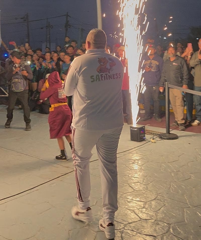 Para arrancar los trabajos deportivos en ese lugar, Samuel pidió que el maestro de ceremonias lo llamara como si fuera un boxeador, para salir del gimnasio corriendo, en un pants blanco con guida al tiempo que juegos pirotécnicos se encendían.