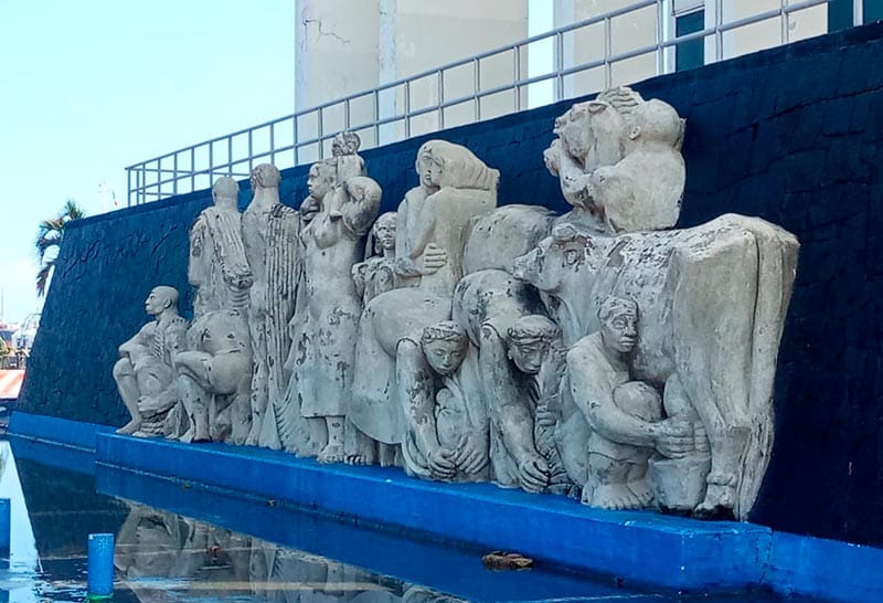 A la vista su arquitectura es categórica y de primer nivel pero también está a lo sumo dañada, en algunas partes se carcome y qué decir de la escultura que presenta a dos hombres sacando una red de pescar en el mar y las olas se transforman en la figura de una mujer, otra dedicada a la agricultura, se encuentran no en mal estado sino en la tragedia.