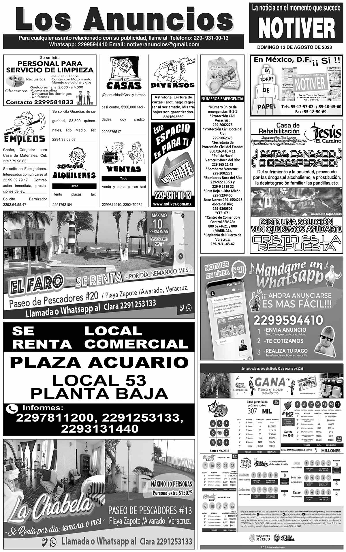 PRIMERA LA PORTADA - DOMINGO, 13 DE AGOSTO 2023 * ADÁN AUGUSTO Y CHEKO JALAN A 20 MIL VERACRUZANOS A LA MACROPLAZA * VINIERON DE TODOS LADOS 13 agosto 2023 Y LOS ANUNCIOS... Más Noticias ¡LEVANTA TANTITO Y MAÑANA OTRO NORTECITO! - *HACIA EL DOMINGO 14, OTRO FRENTE EN EL GOLFO DE MÉXICO. ¡LOS ABANDONARON! - EN COYUTLA LA ENCUESTA | - LA RENUNCIARON! ¡YEYA YA ES FISCALA! - Y ES JAROCHA ¡SEGOB RECONOCE A PATY! ¡MATAN A DOS GANADEROS! - EN EL SUR DEL ESTADO - *En San Juan Evangelista y en Ciudad Isla ¡ACALAMBRAN A HÉCTOR! ¡VOLVERÁ ABRIR EL BALUARTE DE SANTIAGO! ¡NAHLE LE JALA LAS OREJAS A SU GABINETE! - TENÍA QUE SER ¡Y QUIÉN ES LISBETH AURELIA JIMÉNEZ AGUIRRE!
