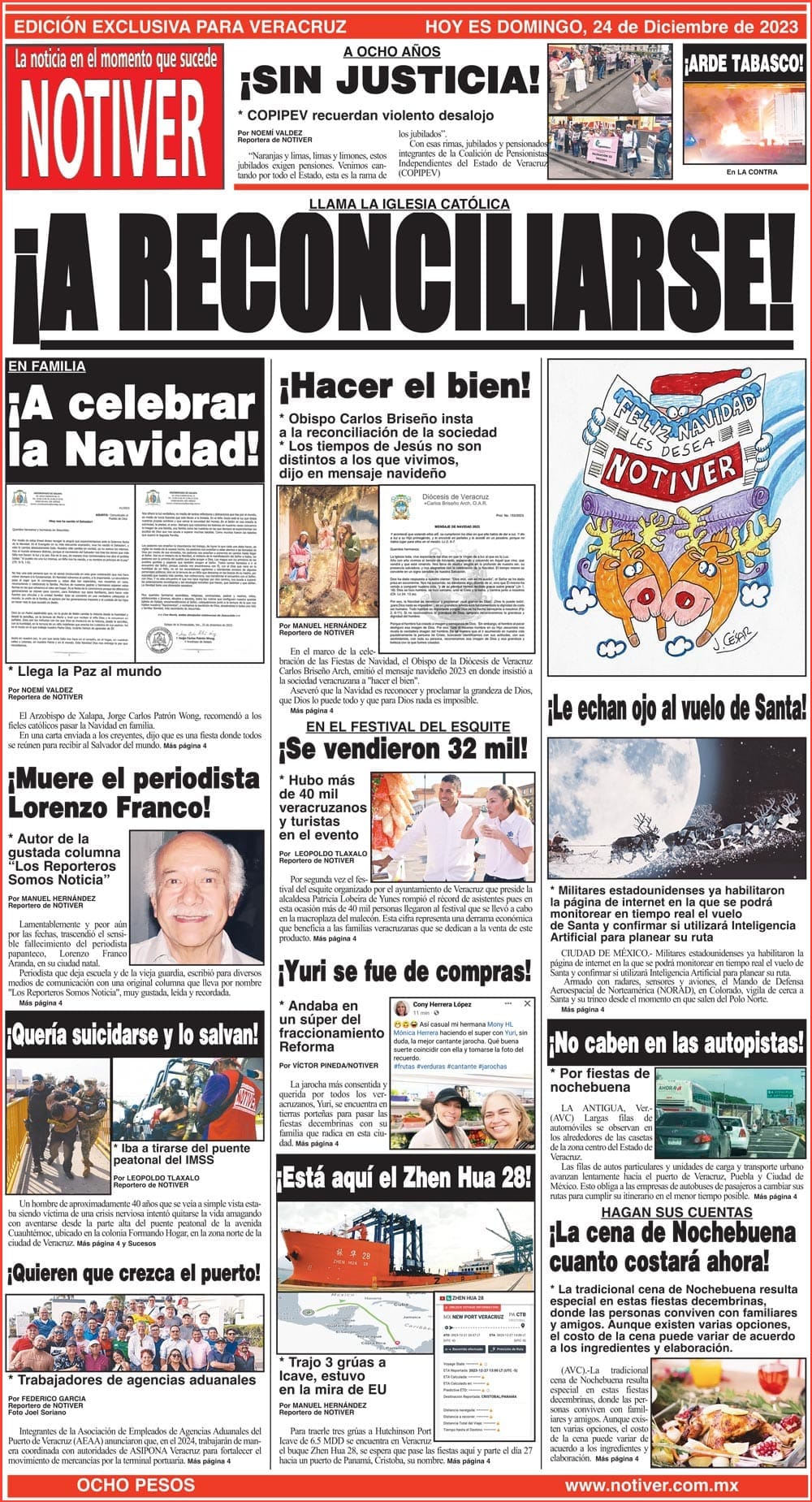 PRIMERA LA PORTADA - DOMINGO 24 DE DICIEMBRE 2023 LLAMA LA IGLESIA CATÓLICA - * OBISPO CARLOS BRISEÑO INSTA A LA RECONCILIACIÓN DE LA SOCIEDAD * LOS TIEMPOS DE JESÚS NO SON DISTINTOS A LOS QUE VIVIMOS, DIJO EN MENSAJE NAVIDEÑO 24 diciembre 2023 Y LOS ANUNCIOS...Cotice su Anuncio Su Correo Electrónico: Texto: Enviar