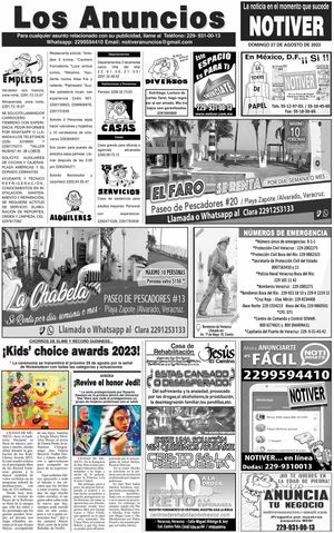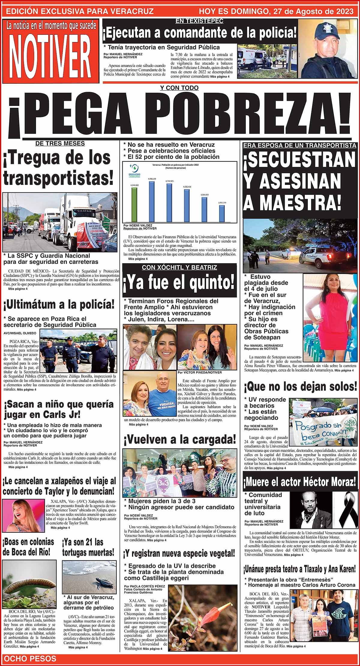 PRIMERA LA PORTADA - DOMINGO, 27 DE AGOSTO 2023 Y CON TODO - * NO SE HA RESUELTO EN VERACRUZ * PESE A CELEBRACIONES OFICIALES * EL 52 POR CIENTO DE LA POBLACIÓN 27 agosto 2023 Y LOS ANUNCIOS... Más Noticias ¡YA TIENE PUENTAZO EL SEGURO! ¡LA CARTELERA! | LA ÚLTIMA Y NOS VAMOS - De vacaciones andamos en Papantla, Veracruz, y en días pasados escuchamos dos charlas sobre los exploradores y la iconografía del basamento de los Nichos y El Tajín, en el Museo Teodoro Cano… ¡MAESTROS TENDRÁN BONO Y AGUINALDO! ¡LES MOCHAN EL AGUA A RÍO MEDIO! - *Por mantenimiento ¡SALE HUMO DE LAS ALCANTARILLAS! - *Explosiones en Jardines de Mocambo ¡LEY GARROTE! - *Paguen ya impuestos o van multas ¡YA TIENE MURAL TITO NIEVES! ¡PRESENTA LOTERÍA NACIONAL EL ÁLBUM DEL MUNDIAL! LOS CARTONES ¡PREVENCIONES PARA EVITAR EL INCREMENTO DE LAS INFECCIONES RESPIRATORIAS AGUADAS!