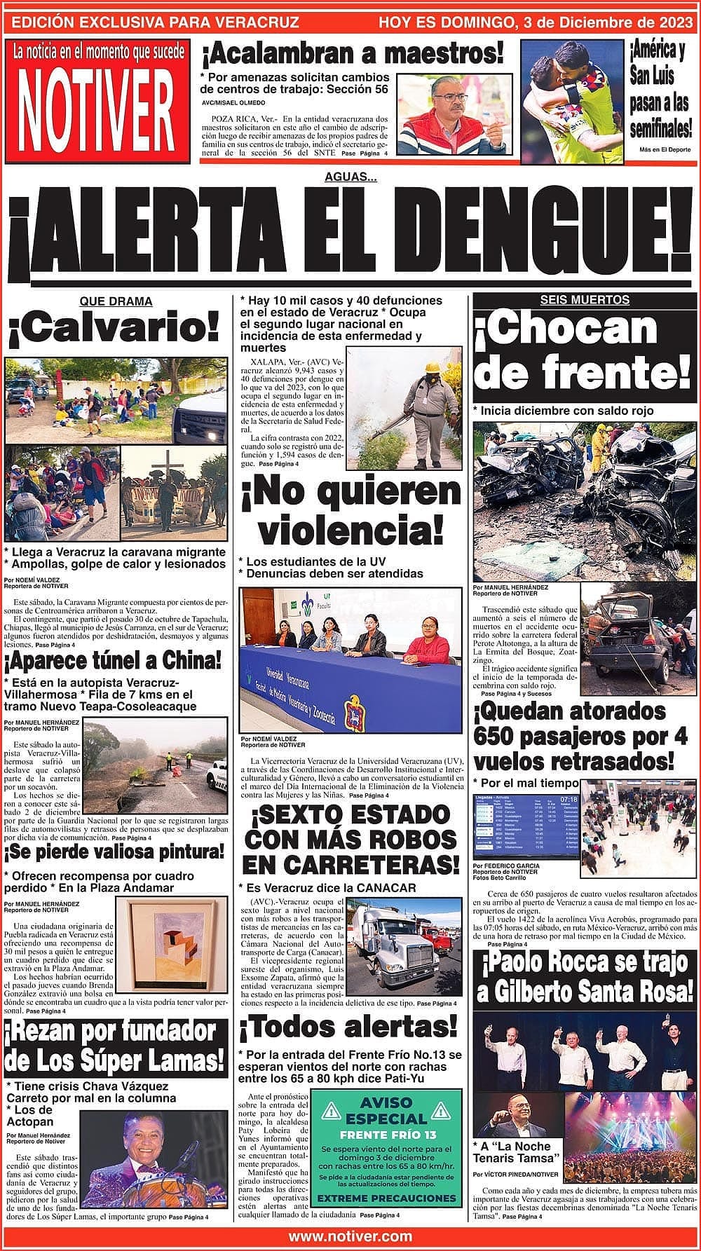PRIMERA LA PORTADA - DOMINGO 3 DE DICIEMBRE 2023 AGUAS... - * HAY 10 MIL CASOS Y 40 DEFUNCIONES EN EL ESTADO DE VERACRUZ * OCUPA EL SEGUNDO LUGAR NACIONAL EN INCIDENCIA DE ESTA ENFERMEDAD Y MUERTES 3 diciembre 2023 Y LOS ANUNCIOS...Cotice su Anuncio Su Correo Electrónico: Texto: Enviar