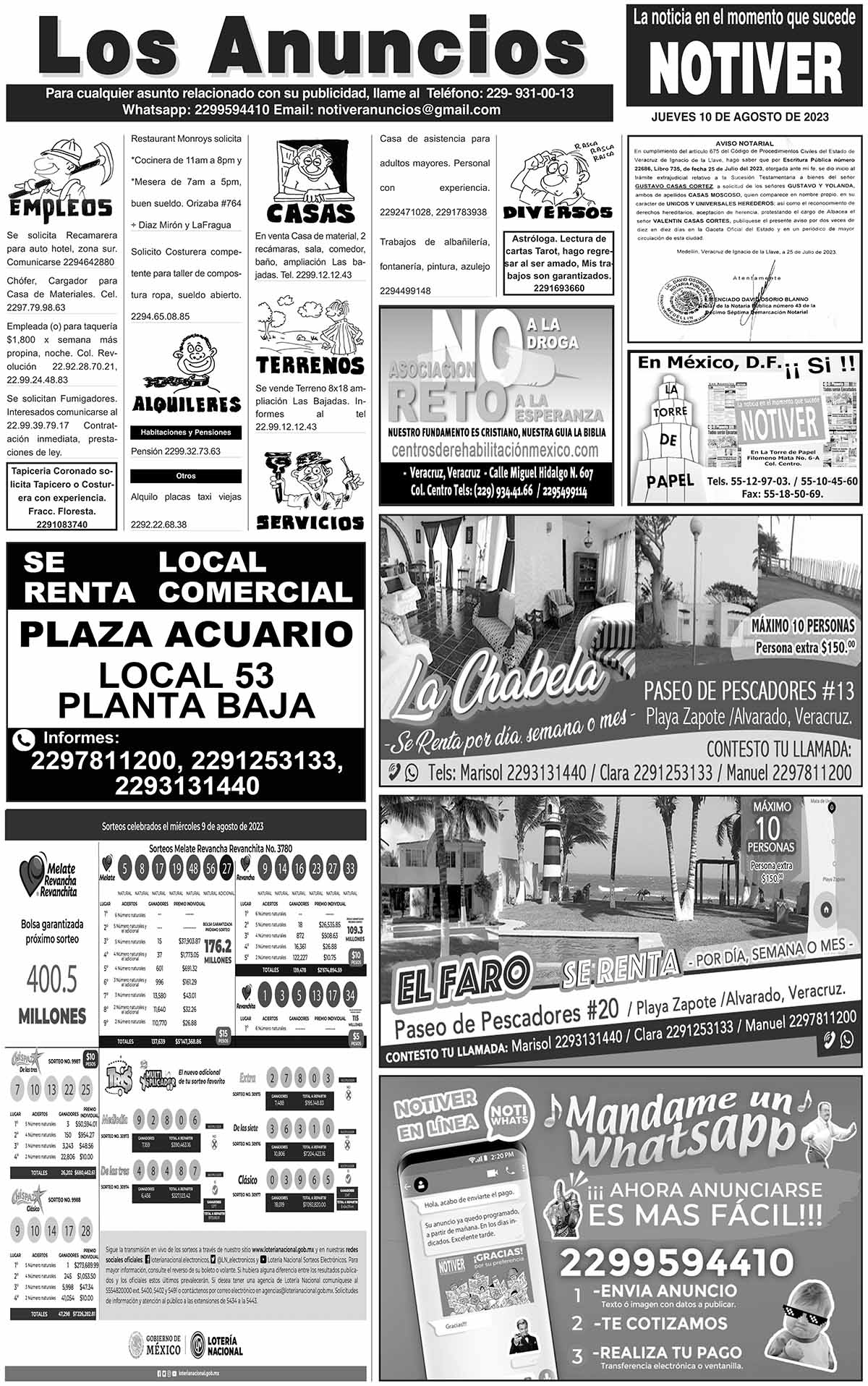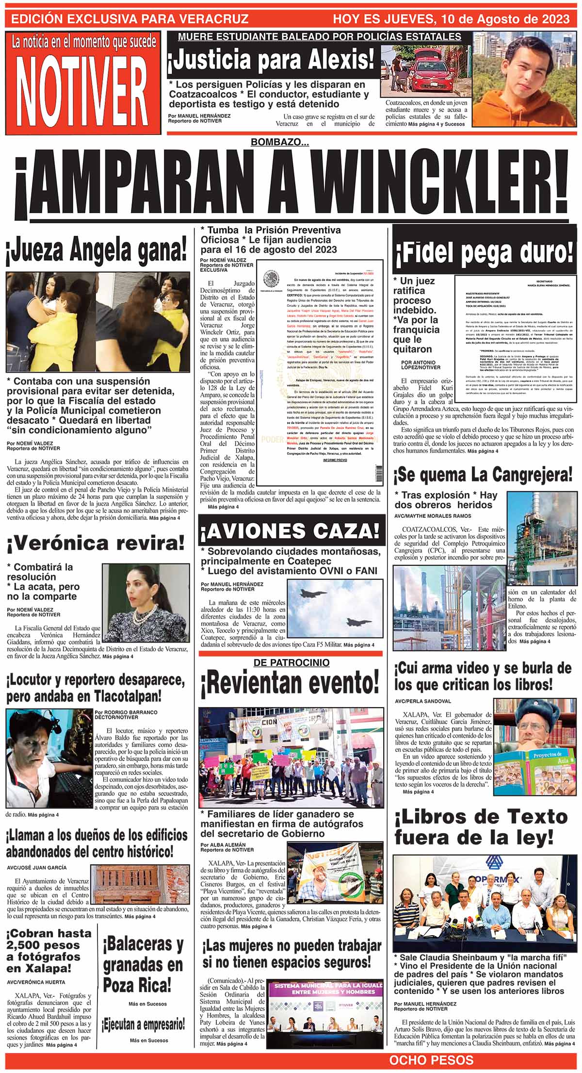 PRIMERA LA PORTADA - JUEVES, 10 DE AGOSTO 2023 *AMPARAN A WINCKLER! *JUEZA ANGELA GANA *FIDEL PEGA DURO *JUSTICIA PARA ALEXIS 10 agosto 2023 Y LOS ANUNCIOS... Más Noticias ¡ASESINAN A EX CANDIDATO A LA ALCALDÍA DE MISANTLA! - *Era del Movimiento Ciudadano ¡HOMENAJE PÓSTUMO AL “PAPO”! ¡SE VA EL FOFO! - DEL PRI LA ENCUESTA | - FELICIDADES! ¡SE DESCARRILA EL TREN! - PA’SUSTO ¡YA NO COBRARÁN PARQUÍMETROS! ¡SE VAN POR LAS NUBES LOS PAVOS! ¡DETECTAR DISFAGIA A TIEMPO PREVIENE LAS COMPLICACIONES DE SALUD: IMSS VERACRUZ NORTE! ¡CUATRO MUNICIPIOS SUBIRÁN EL PREDIAL! - YA SE SUPO ¡CUMBRE DE TRANSPORTE MULTIMODAL!