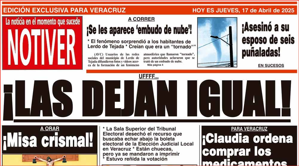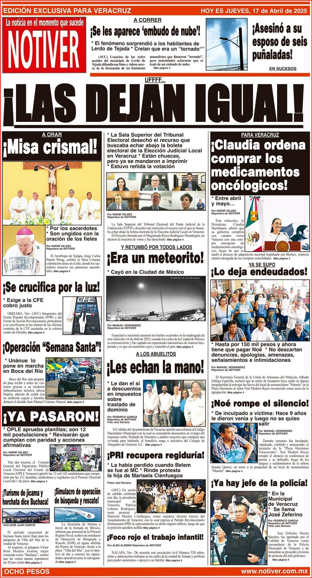 PRIMERA LA PORTADA - JUEVES 17 DE ABRIL 2025 UFFFF... - *LA SALA SUPERIOR DEL TRIBUNAL ELECTORAL DESECHÓ EL RECURSO QUE BUSCABA ECHAR ABAJO LA BOLETA ELECTORAL DE LA ELECCIÓN JUDICIAL LOCAL EN VERACRUZ *ESTÁN CHUECAS, PERO YA SE MANDARON A IMPRIMIR *ESTUVO REÑIDA LA VOTACIÓN 17 abril 2025