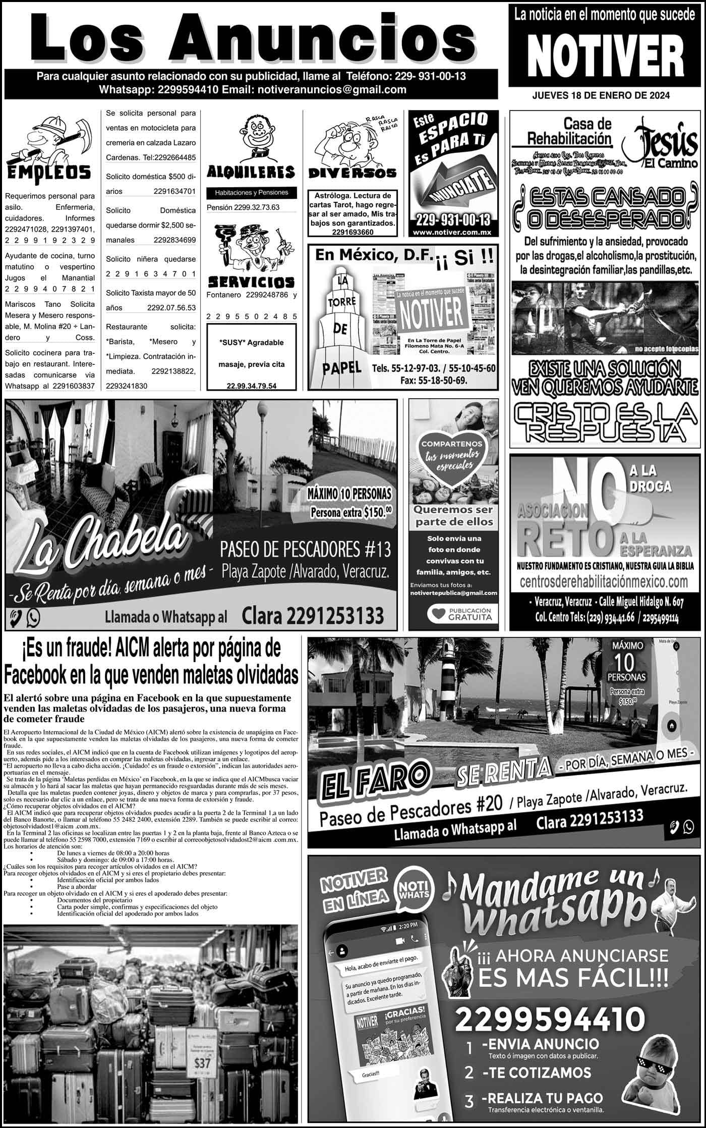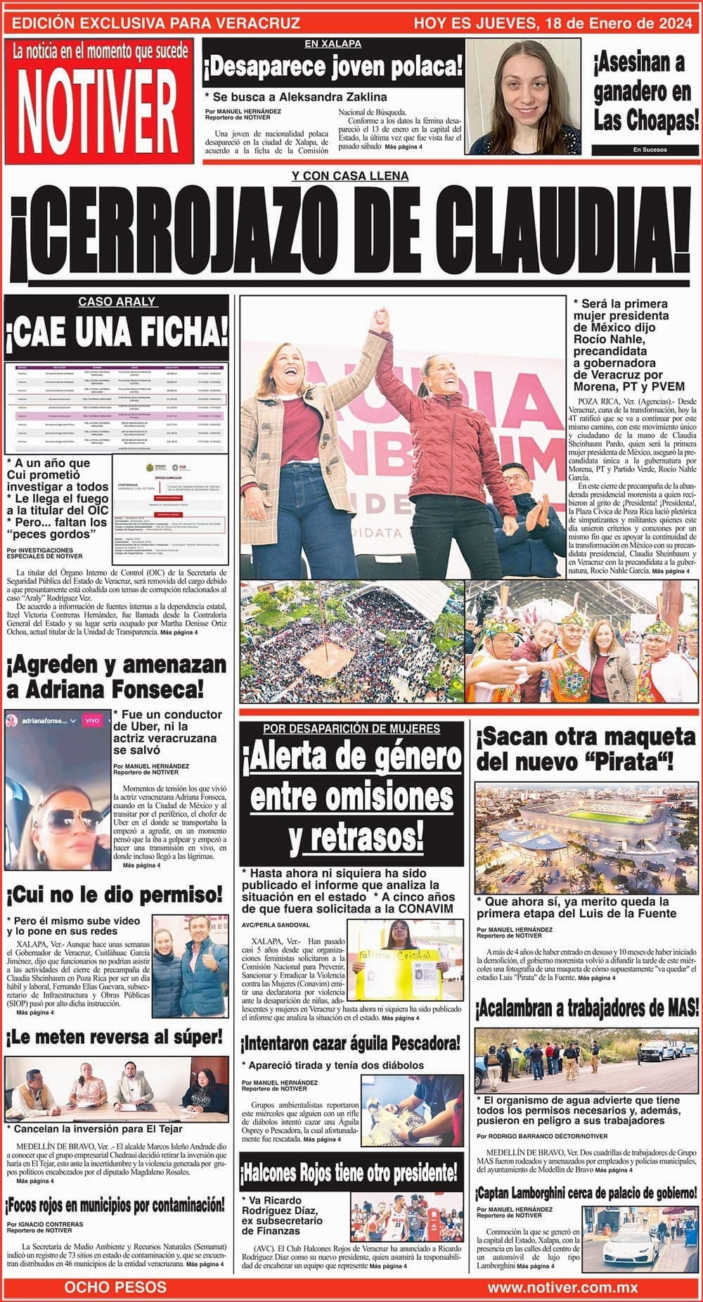 PRIMERA LA PORTADA - JUEVES 18 DE ENERO 2024 Y CON CASA LLENA - * SERÁ LA PRIMERA MUJER PRESIDENTA DE MÉXICO DIJO ROCÍO NAHLE, PRECANDIDATA A GOBERNADORA DE VERACRUZ POR MORENA, PT Y PVEM 18 enero 2024 Y LOS ANUNCIOS...Cotice su Anuncio Su Correo Electrónico: Texto: Enviar