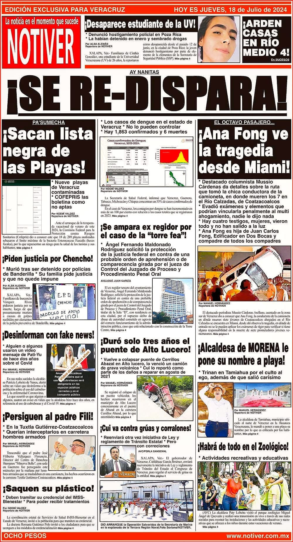 PRIMERA LA PORTADA - JUEVES 18 DE JULIO 2024 AY NANITAS - * LOS CASOS DE DENGUE EN EL ESTADO DE VERACRUZ * NO LO PUEDEN CONTROLAR * HAY 1,863 CONFIRMADOS Y 6 MUERTES 18 julio 2024