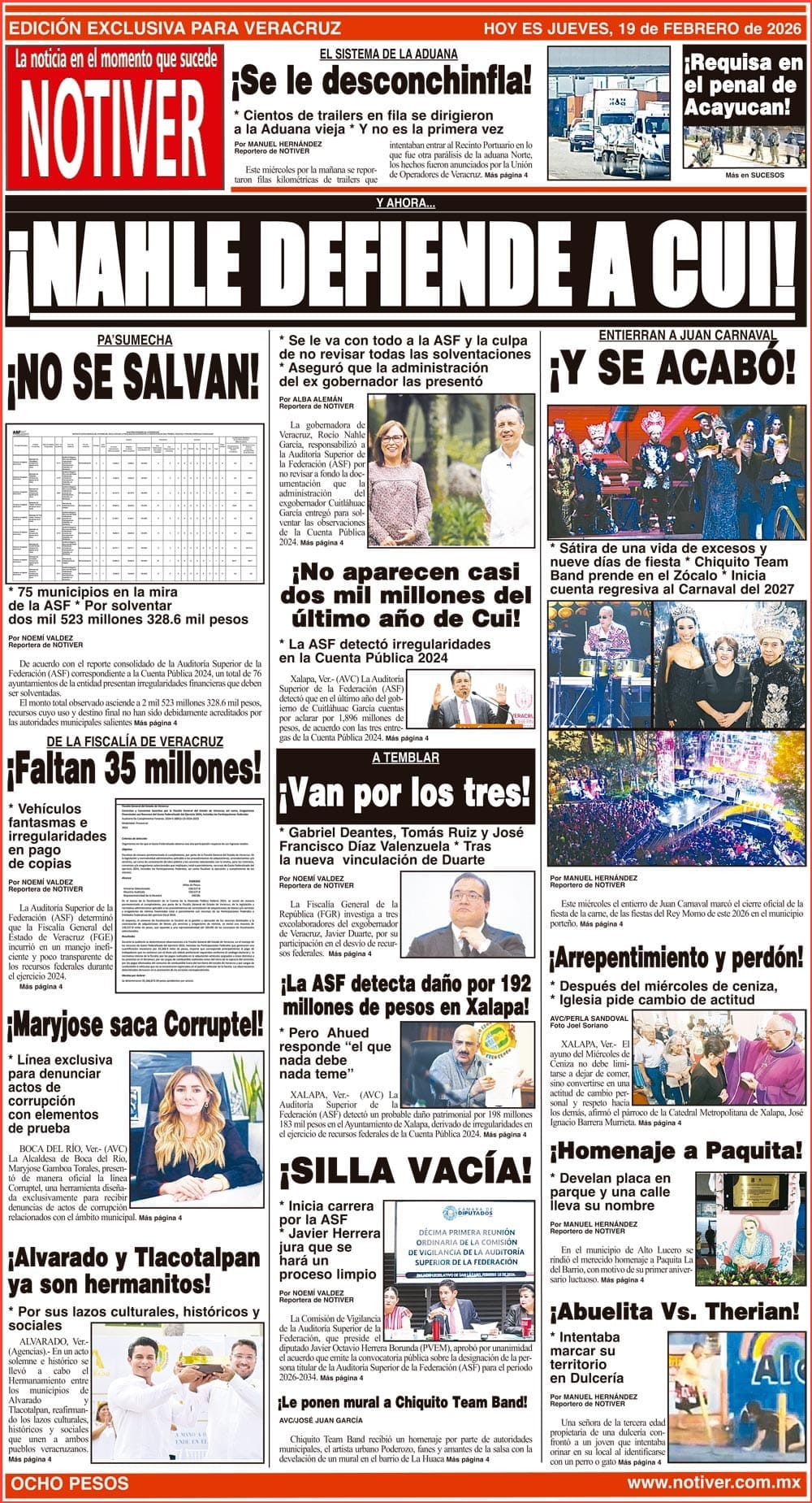 PRIMERA LA PORTADA - JUEVES 19 DE FEBRERO 2026 Y AHORA... - *SE LE VA CON TODO A LA ASF Y LA CULPA DE NO REVISAR TODAS LAS SOLVENTACIONES *ASEGURÓ QUE LA ADMINISTRACIÓN DEL EX GOBERNADOR LAS PRESENTÓ 19 febrero 2026
