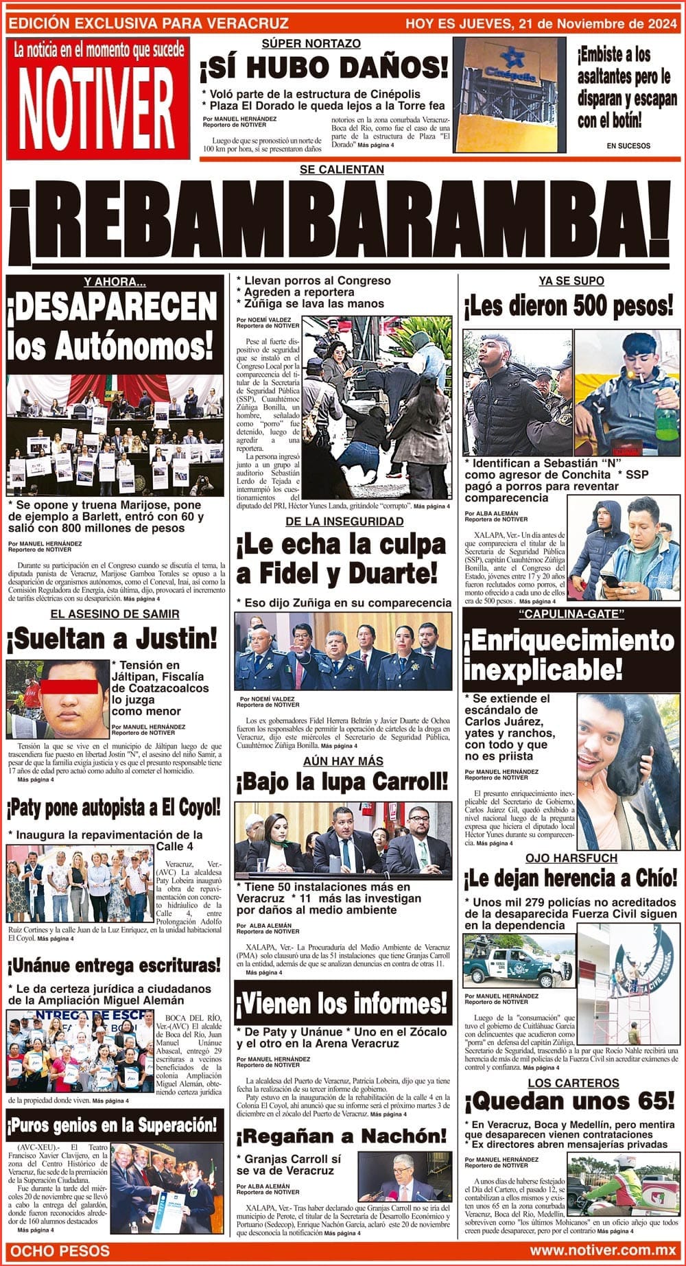 PRIMERA LA PORTADA - JUEVES 21 DE NOVIEMBRE 2024 SE CALIENTAN - * LLEVAN PORROS AL CONGRESO * AGREDEN A REPORTERA * ZÚÑIGA SE LAVA LAS MANOS 21 noviembre 2024