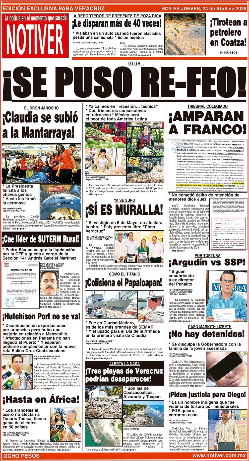 PRIMERA LA PORTADA - JUEVES 24 DE ABRIL 2025 GLUB... - *YA CAÍMOS EN “RECESIÓN… TÉCNICA” *DOS TRIMESTRES CONSECUTIVOS EN RETROCESO * MÉXICO SERÁ EL PEOR DE TODA AMÉRICA LATINA 24 abril 2025