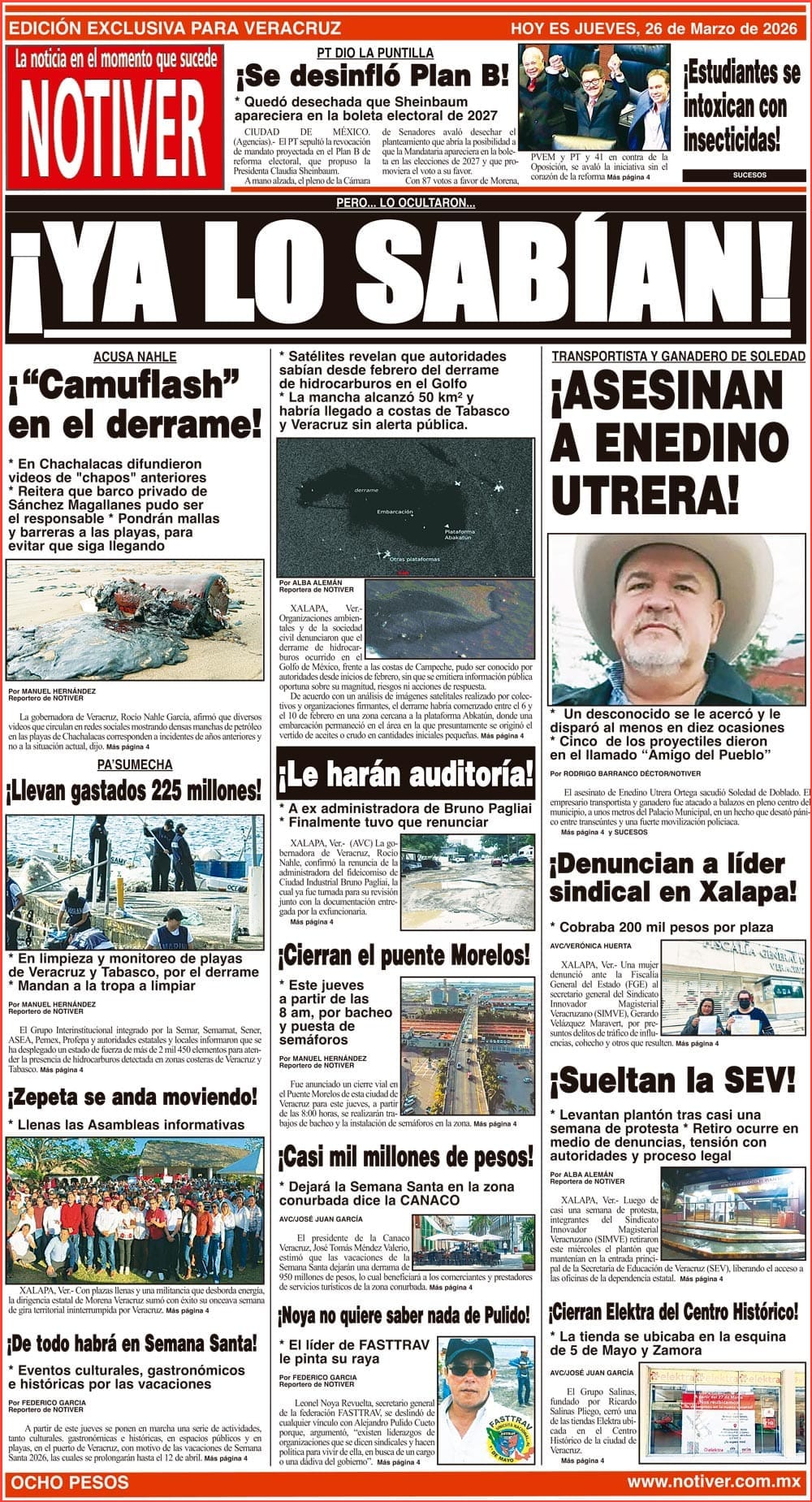 PRIMERA LA PORTADA - JUEVES 26 DE MARZO 2026 PERO... LO OCULTARON... - *SATÉLITES REVELAN QUE AUTORIDADES SABÍAN DESDE FEBRERO DEL DERRAME DE HIDROCARBUROS EN EL GOLFO *LA MANCHA ALCANZÓ 50 KM2 Y HABRÍA LLEGADO A COSTAS DE TABASCO Y VERACRUZ SIN ALERTA PÚBLICA. 26 marzo 2026