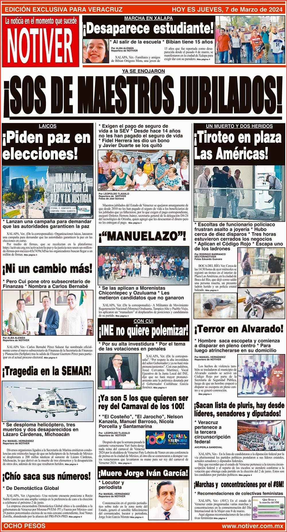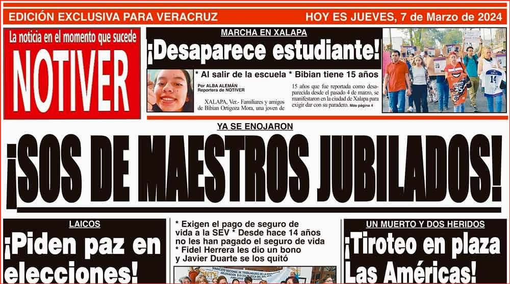 PRIMERA LA PORTADA - JUEVES 7 DE MARZO 2024 YA SE ENOJARON - * EXIGEN EL PAGO DE SEGURO DE VIDA A LA SEV * DESDE HACE 14 AÑOS NO LES HAN PAGADO EL SEGURO DE VIDA * FIDEL HERRERA LES DIO UN BONO Y JAVIER DUARTE SE LOS QUITÓ 7 marzo 2024 Y LOS ANUNCIOS...Cotice su Anuncio Su Correo Electrónico: Texto: Enviar