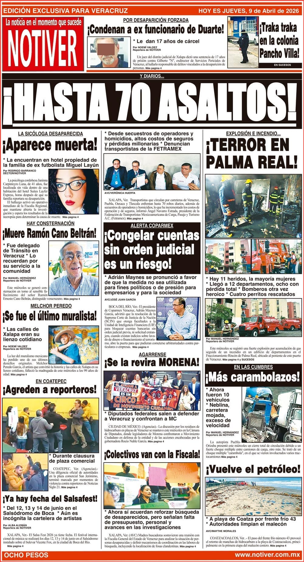 PRIMERA LA PORTADA - JUEVES 9 DE ABRIL 2026 Y DIARIOS... - *DESDE SECUESTROS DE OPERADORES Y HOMICIDIOS, ALTOS COSTOS DE SEGUROS Y PÉRDIDAS MILLONARIAS *DENUNCIAN TRANSPORTISTAS DE LA FETRAMEX 9 abril 2026