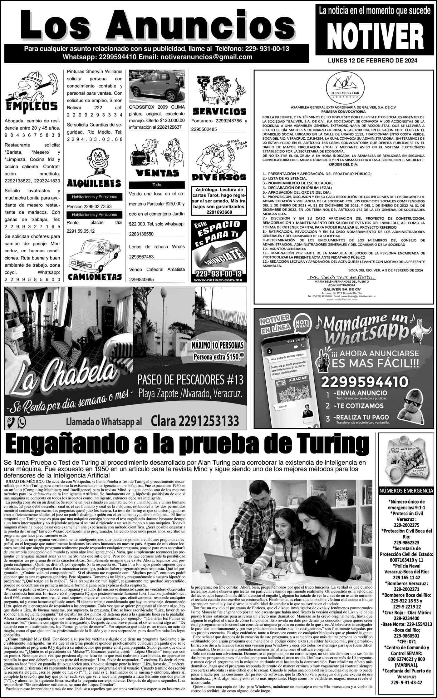 PRIMERA LA PORTADA - LUNES 12 DE FEBRERO 2024 TA GUENO - * HABLA LA ÁRBITRA DEL INE; LES VA APLICAR LA LEY * NO SE PASEN, SE LAS VA A APLICAR 12 febrero 2024 Y LOS ANUNCIOS...Cotice su Anuncio Su Correo Electrónico: Texto: Enviar