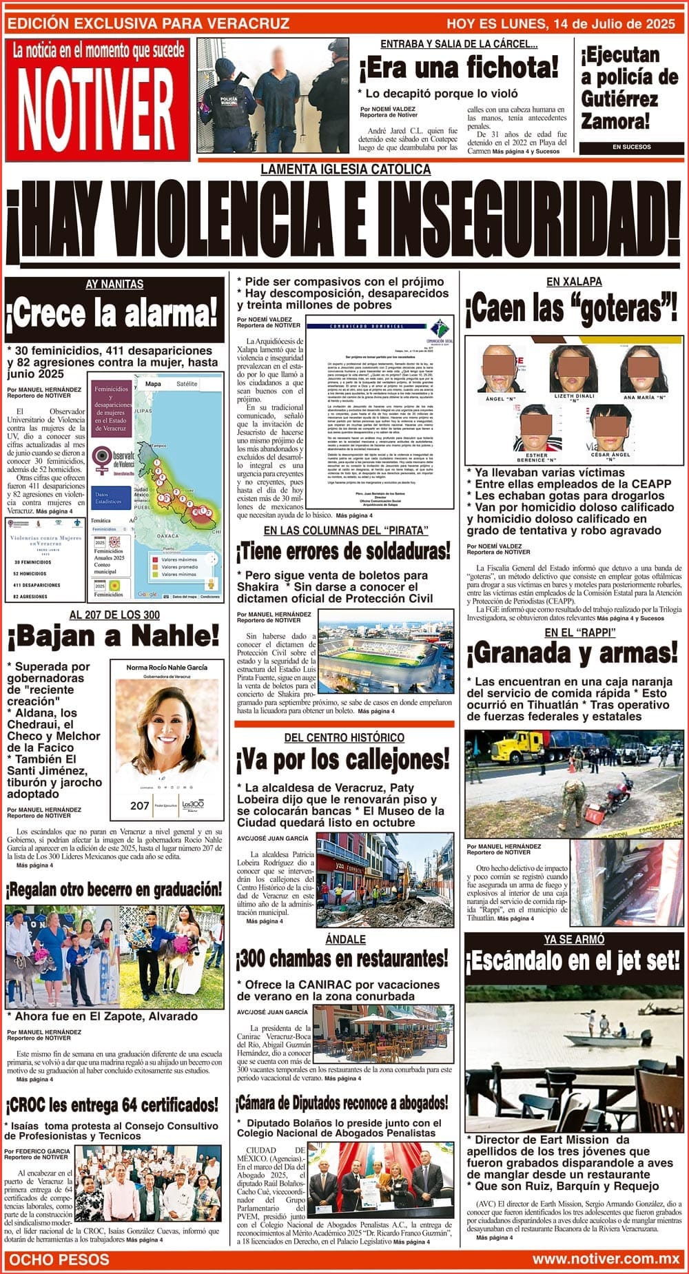 PRIMERA LA PORTADA - LUNES 14 DE JULIO 2025 LAMENTA IGLESIA CATÓLICA - *PIDE SER COMPASIVOS CON EL PRÓJIMO *HAY DESCOMPOSICIÓN, DESAPARECIDOS Y TREINTA MILLONES DE POBRES 14 julio 2025