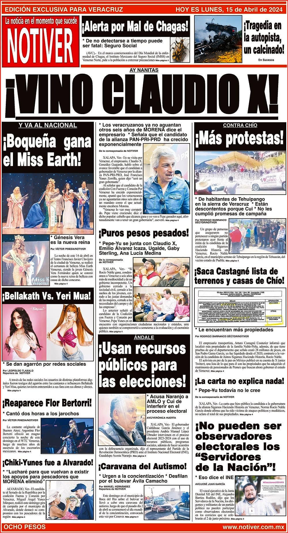 PRIMERA LA PORTADA - LUNES 15 DE ABRIL 2024 AY NANITAS - * LOS VERACRUZANOS YA NO AGUANTAN OTROS SEIS AÑOS DE MORENA DICE EL EMPRESARIO * SEÑALA QUE EL CANDIDATO DE LA ALIANZA PAN-PRI-PRD HA CRECIDO EXPONENCIALMENTE 15 abril 2024 Y LOS ANUNCIOS...
