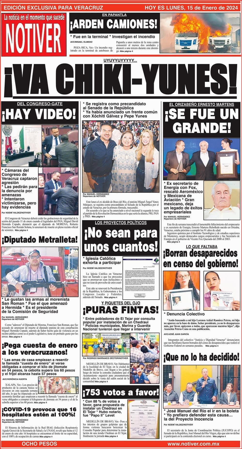 PRIMERA LA PORTADA - LUNES 15 DE ENERO 2024 UYUYYUYYYYY... - * SE REGISTRA COMO PRECANDIDATO AL SENADO DE LA REPÚBLICA * YA HABÍA ANUNCIADO UN FRENTE COMÚN CON XÓCHITL GÁLVEZ Y PEPE YUNES 15 enero 2024 Y LOS ANUNCIOS...Cotice su Anuncio Su Correo Electrónico: Texto: Enviar