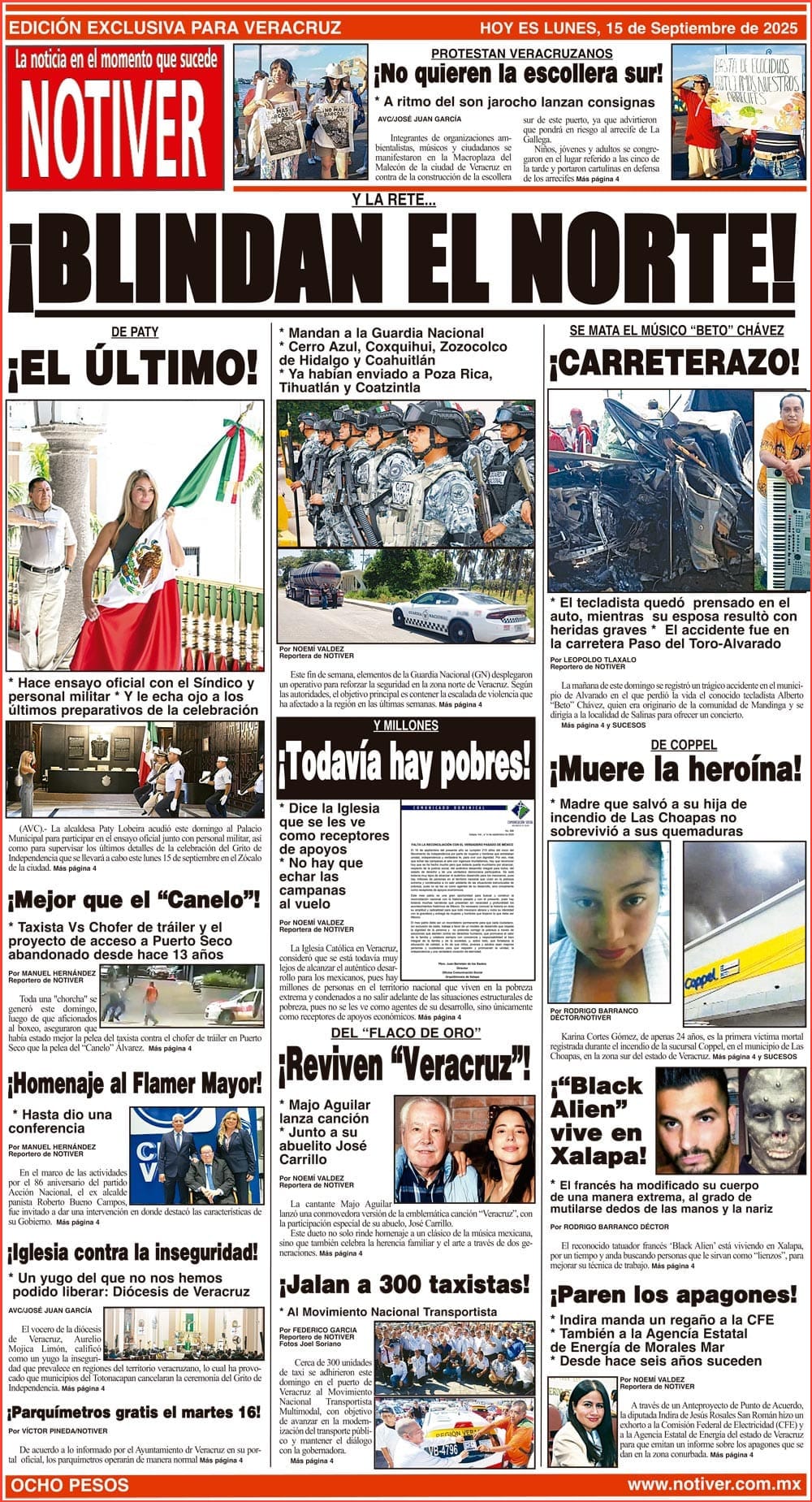 PRIMERA LA PORTADA - LUNES 15 DE SEPTIEMBRE 2025 Y LA RETE... - *MANDAN A LA GUARDIA NACIONAL *CERRO AZUL, COXQUIHUI, ZOZOCOLCO DE HIDALGO Y COAHUITLÁN *YA HABÍAN ENVIADO A POZA RICA, TIHUATLÁN Y COATZINTLA 15 septiembre 2025
