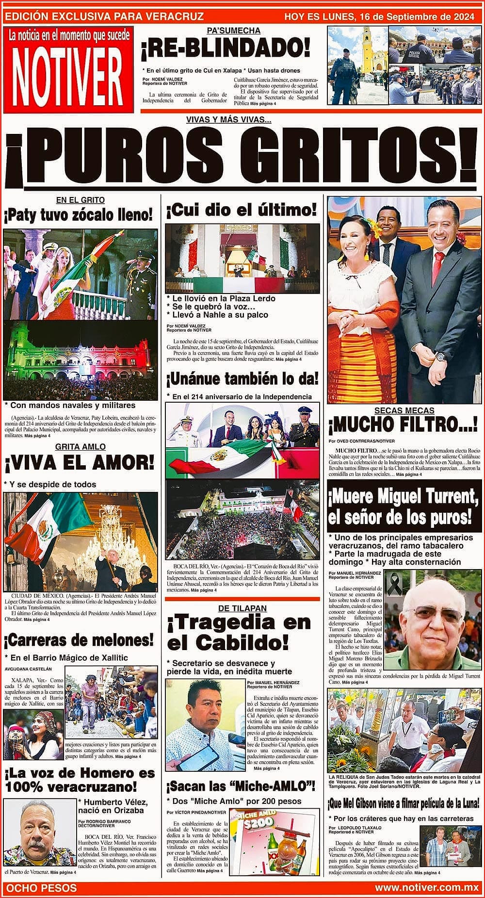 PRIMERA LA PORTADA - LUNES 16 DE SEPTIEMBRE 2024 VIVAS Y MÁS VIVAS... - *¡CUI DIO EL ÚLTIMO! * LE LLOVIÓ EN LA PLAZA LERDO * SE LE QUEBRÓ LA VOZ… * LLEVÓ A NAHLE A SU PALCO 16 septiembre 2024