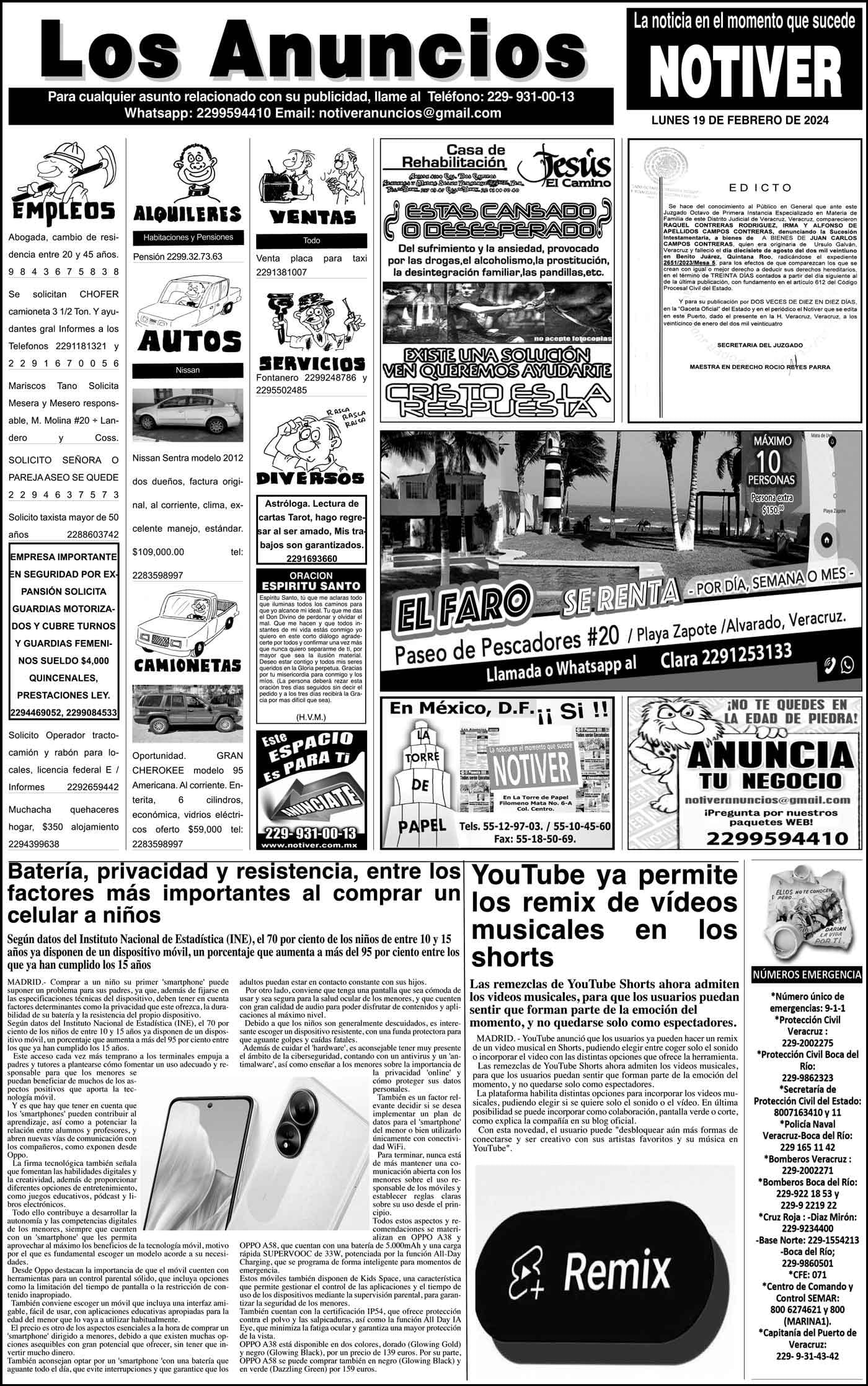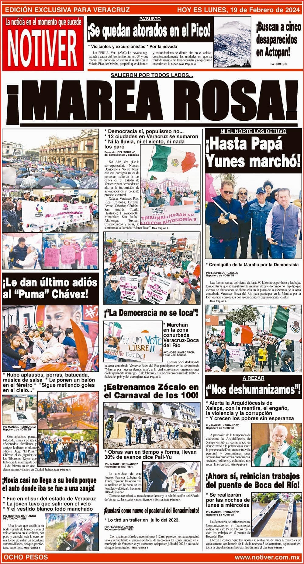 PRIMERA LA PORTADA - LUNES 19 DE FEBRERO 2024 SALIERON POR TODOS LADOS... - * DEMOCRACIA SÍ, POPULISMO NO... * 12 CIUDADES EN VERACRUZ SE SUMARON * NI LA LLUVIA, NI EL VIENTO, NI NADA LOS PARÓ 19 febrero 2024 Y LOS ANUNCIOS...Cotice su Anuncio Su Correo Electrónico: Texto: Enviar