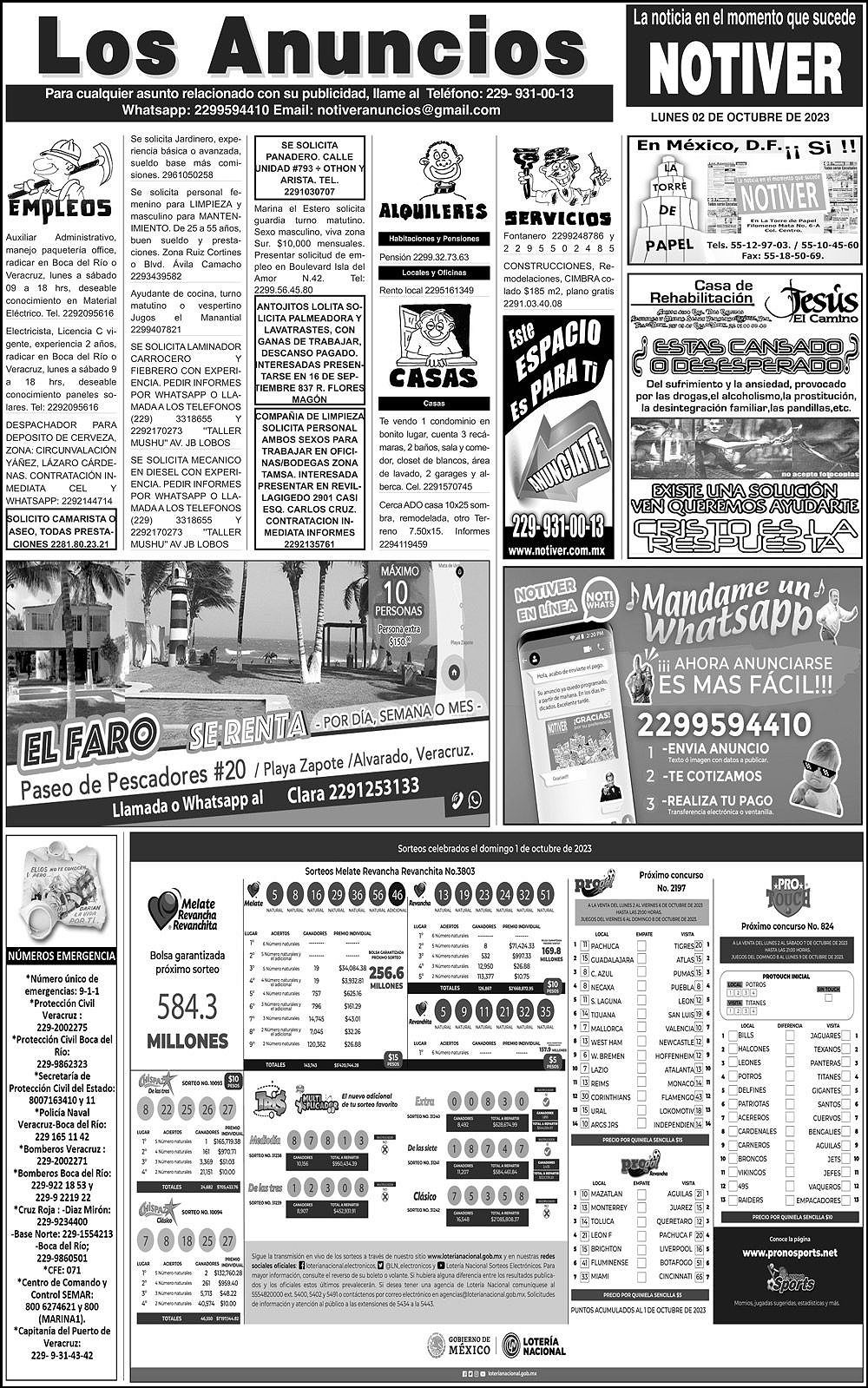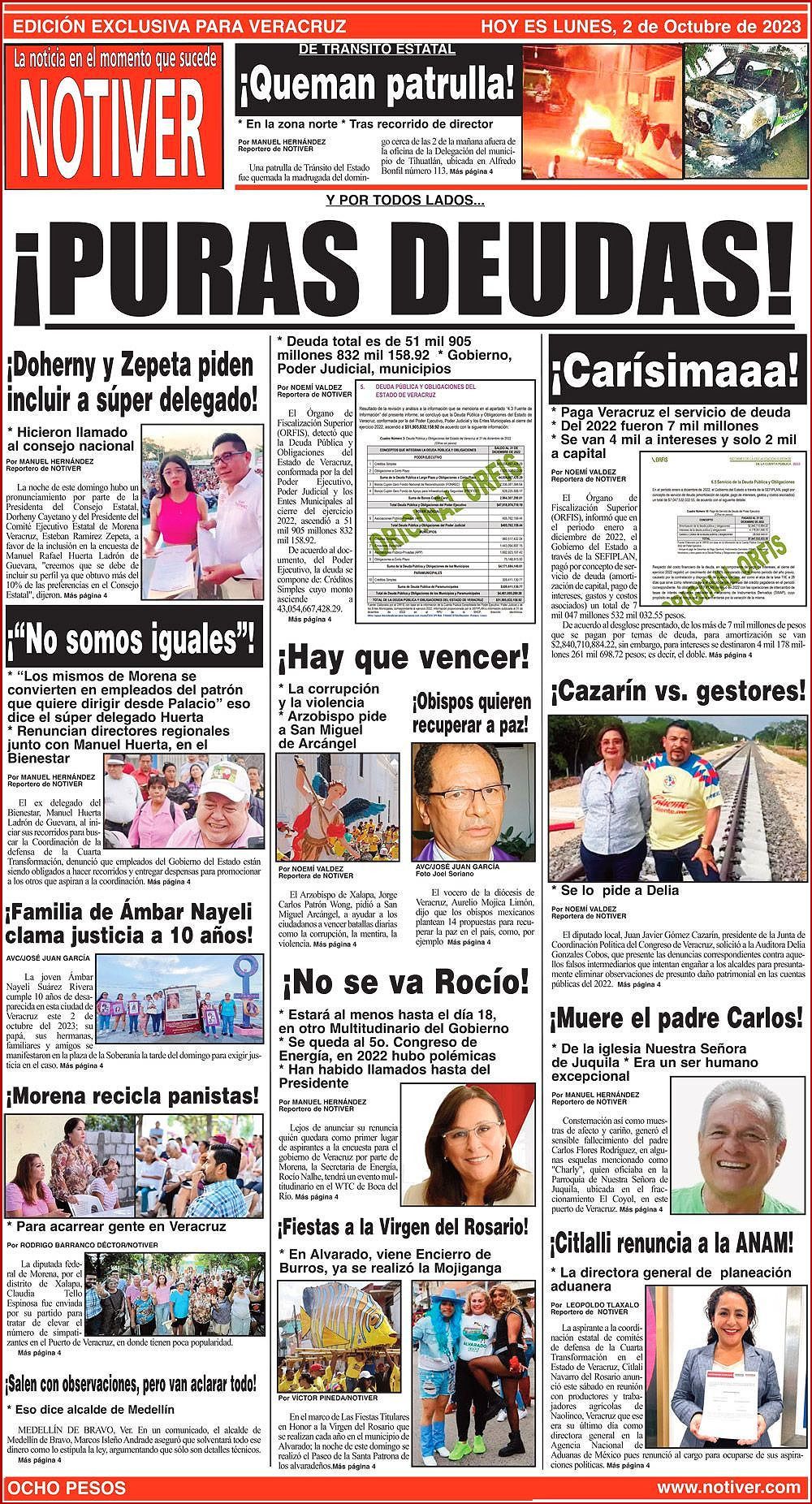 PRIMERA LA PORTADA - LUNES, 2 DE OCTUBRE 2023 Y POR TODOS LADOS... - *DEUDA TOTAL ES DE 51 MIL 905 MILLONES 832 MIL 158.92 *GOBIERNO, PODER JUDICIAL, MUNICIPIOS 2 octubre 2023 Y LOS ANUNCIOS...Cotice su Anuncio Su Correo Electrónico: Texto: Enviar