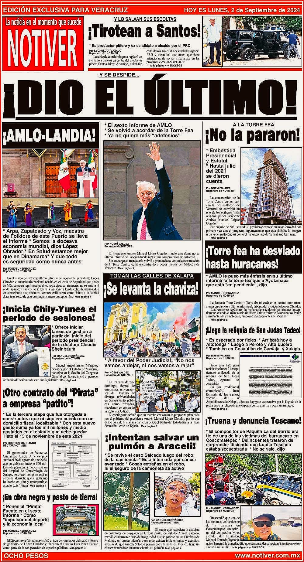 PRIMERA LA PORTADA - LUNES 2 DE SEPTIEMBRE 2024 Y SE DESPIDE... - *EL SEXTO INFORME DE AMLO *SE VOLVIÓ A ACORDAR DE LA TORRE FEA *YA NO QUIERE MÁS “ADEFESIOS” 2 septiembre 2024
