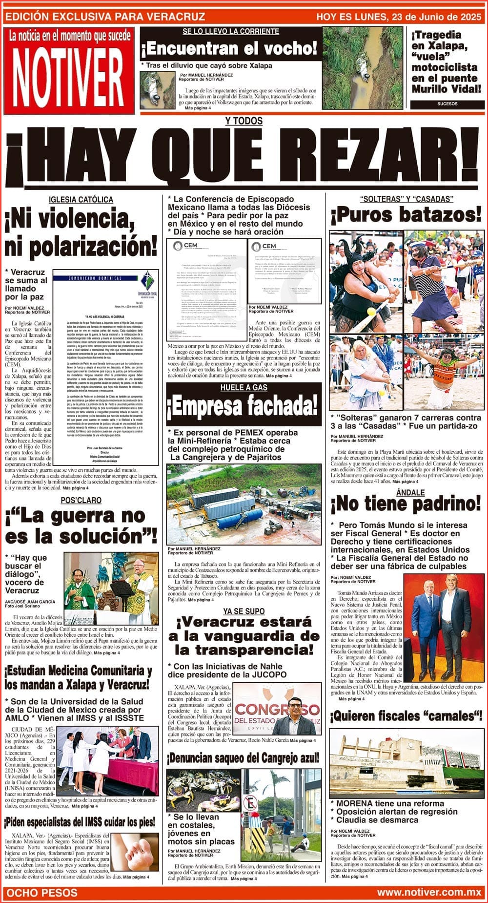 PRIMERA LA PORTADA - LUNES 23 DE JUNIO 2025 Y TODOS - *LA CONFERENCIA DE EPISCOPADO MEXICANO LLAMA A TODAS LAS DIÓCESIS DEL PAÍS *PARA PEDIR POR LA PAZ EN MÉXICO Y EN EL RESTO DEL MUNDO *DÍA Y NOCHE SE HARÁ ORACIÓN 23 junio 2025