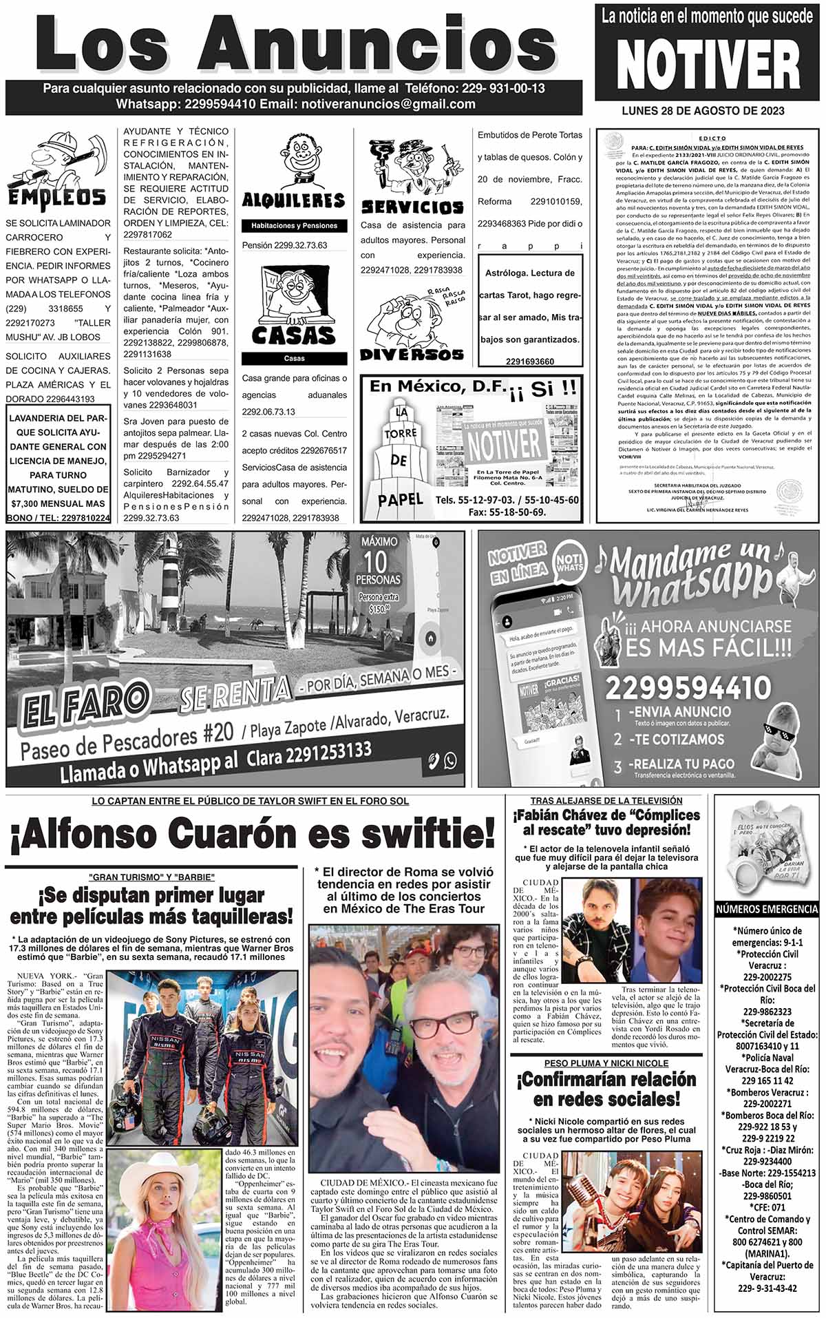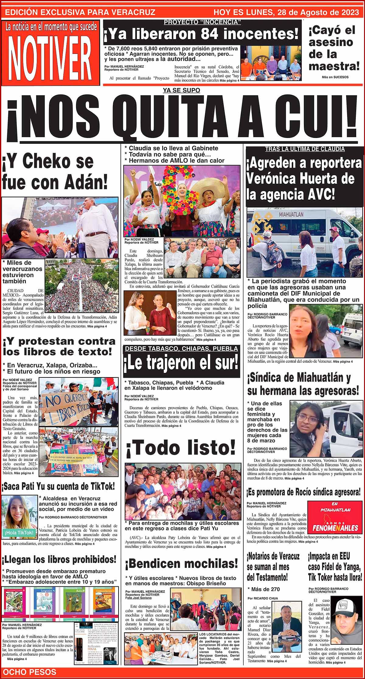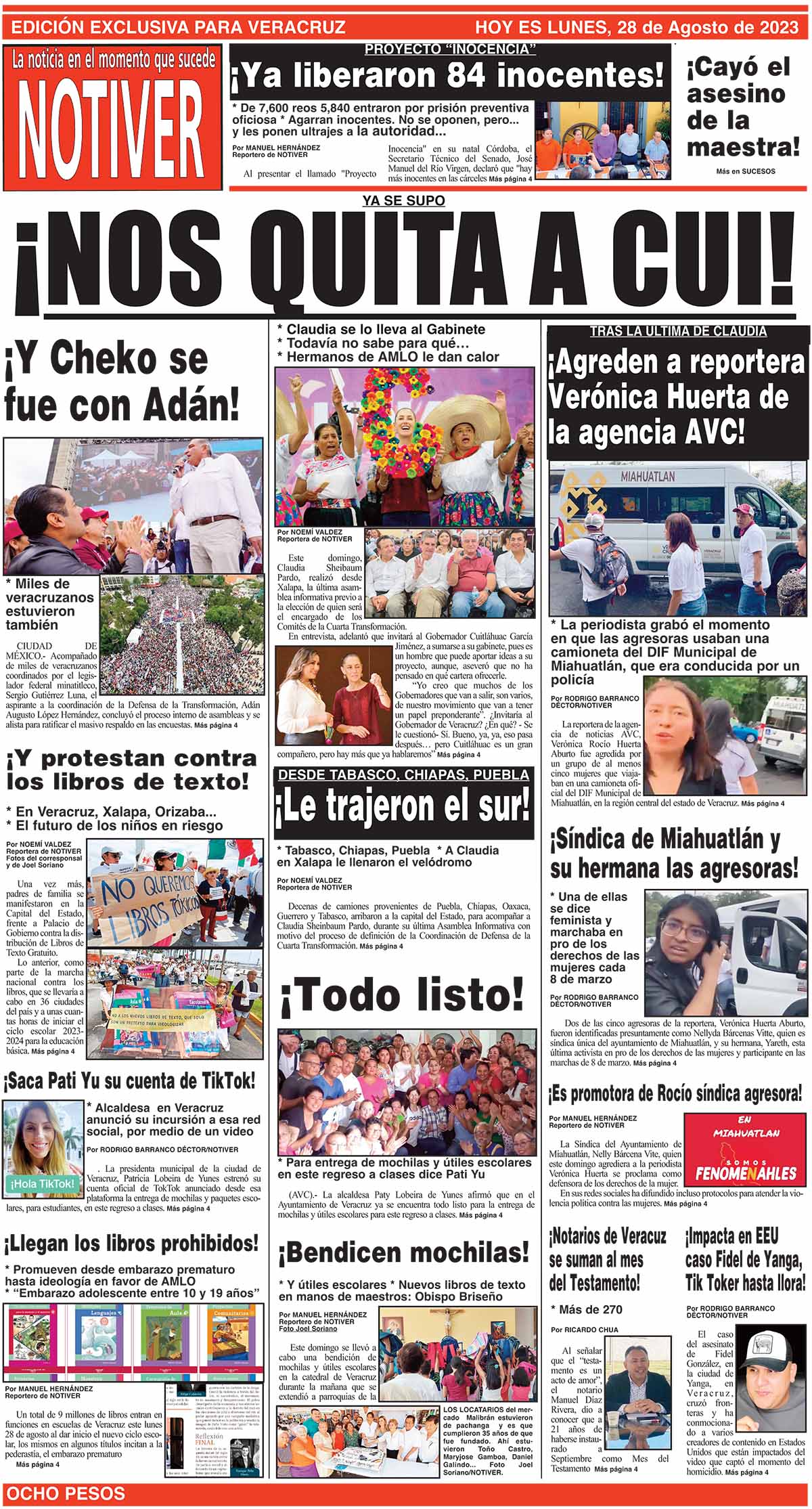 PRIMERA LA PORTADA - LUNES, 28 DE AGOSTO 2023 YA SE SUPO - * CLAUDIA SE LO LLEVA AL GABINETE * TODAVÍA NO SABE PARA QUÉ... * HERMANOS DE AMLO LE DAN CALOR 28 agosto 2023 Y LOS ANUNCIOS... Más Noticias LA PORTADA - SÁBADO 20 DE DICIEMBRE 2025 ¡ÚLTIMO DÍA DEL OTOÑO 2025! - MAÑANA EMPIEZA EL INVIERNO, A LAS 9:03 AM. ¡BLOQUEO DEL SECTOR SALUD EN PLAN DE RÍO! ¡TRAGEDIA EN LA AUTOPISTA VERACRUZ–XALAPA! NOTI-MEME | - YA LLEGÓ LA RAMA! LA ENCUESTA | - YA VIENE! ¡RECONOCIMIENTO A DIRIGENTE DE TAXISTAS! ¡LE VAN A ENTRAR! - *Claudia ordena a Nahle ¡QUIEREN MANDOS DE LA MARINA! - EN LAS POLICÍAS MUNICIPALES ¡ATACA EL VIRUS COXSACKIE, HAY 71 CASOS! - *Con mayor incidencia en 2025 y casos concentrados en Xalapa y Veracruz