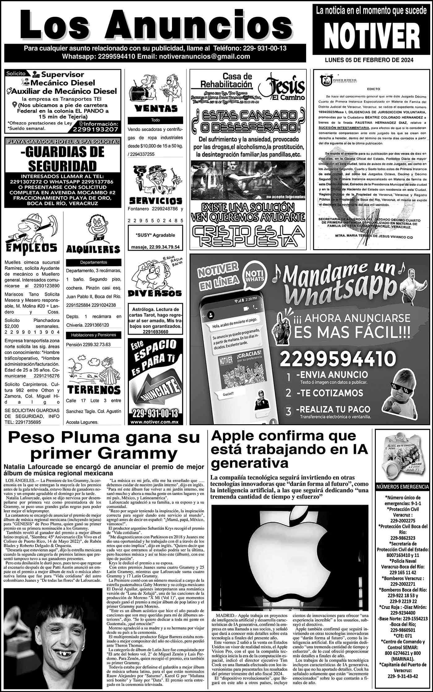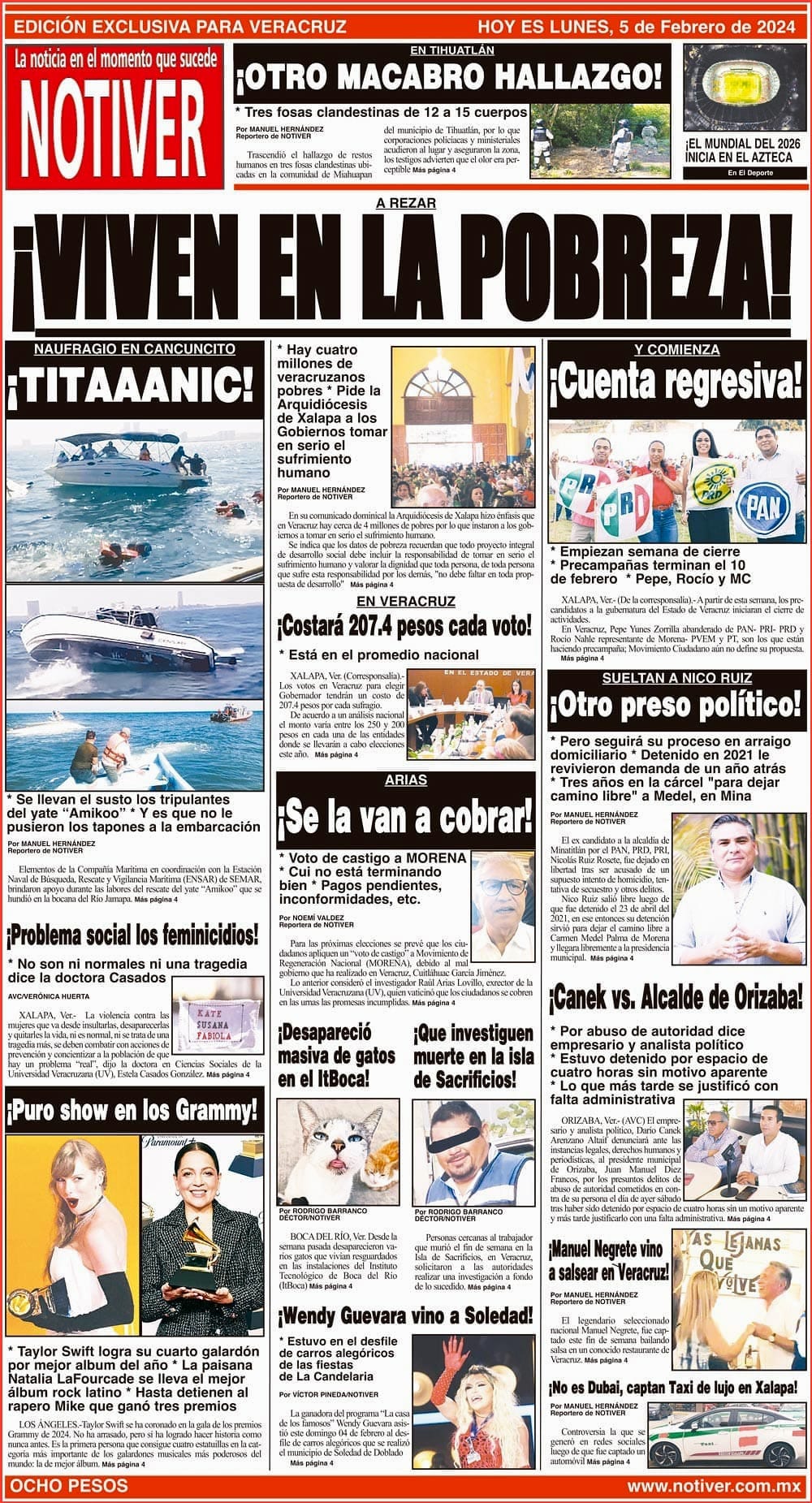 PRIMERA LA PORTADA - LUNES 5 DE FEBRERO 2024 A REZAR - * HAY CUATRO MILLONES DE VERACRUZANOS POBRES * PIDE LA ARQUIDIÓCESIS DE XALAPA A LOS GOBIERNOS TOMAR EN SERIO EL SUFRIMIENTO HUMANO 5 febrero 2024 Y LOS ANUNCIOS...Cotice su Anuncio Su Correo Electrónico: Texto: Enviar