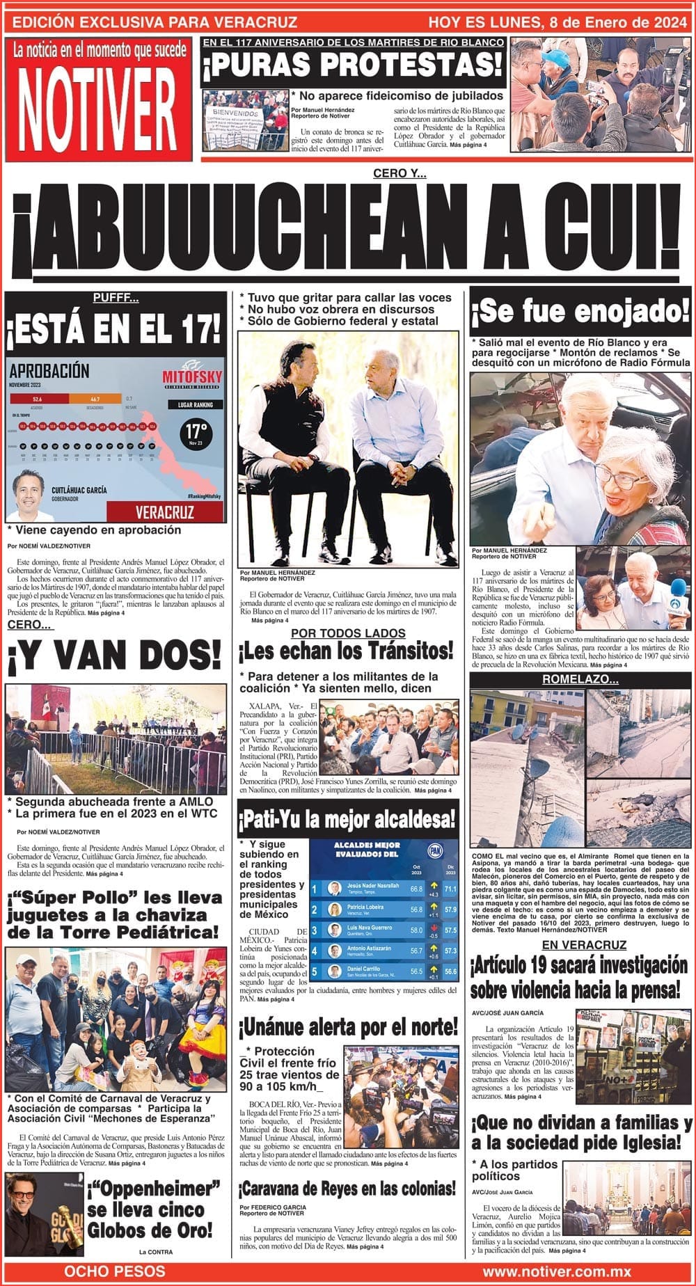 PRIMERA LA PORTADA - LUNES 8 DE ENERO 2024 CERO Y... - * TUVO QUE GRITAR PARA CALLAR LAS VOCES * NO HUBO VOZ OBRERA EN DISCURSOS * SÓLO DE GOBIERNO FEDERAL Y ESTATAL 8 enero 2024 Y LOS ANUNCIOS...