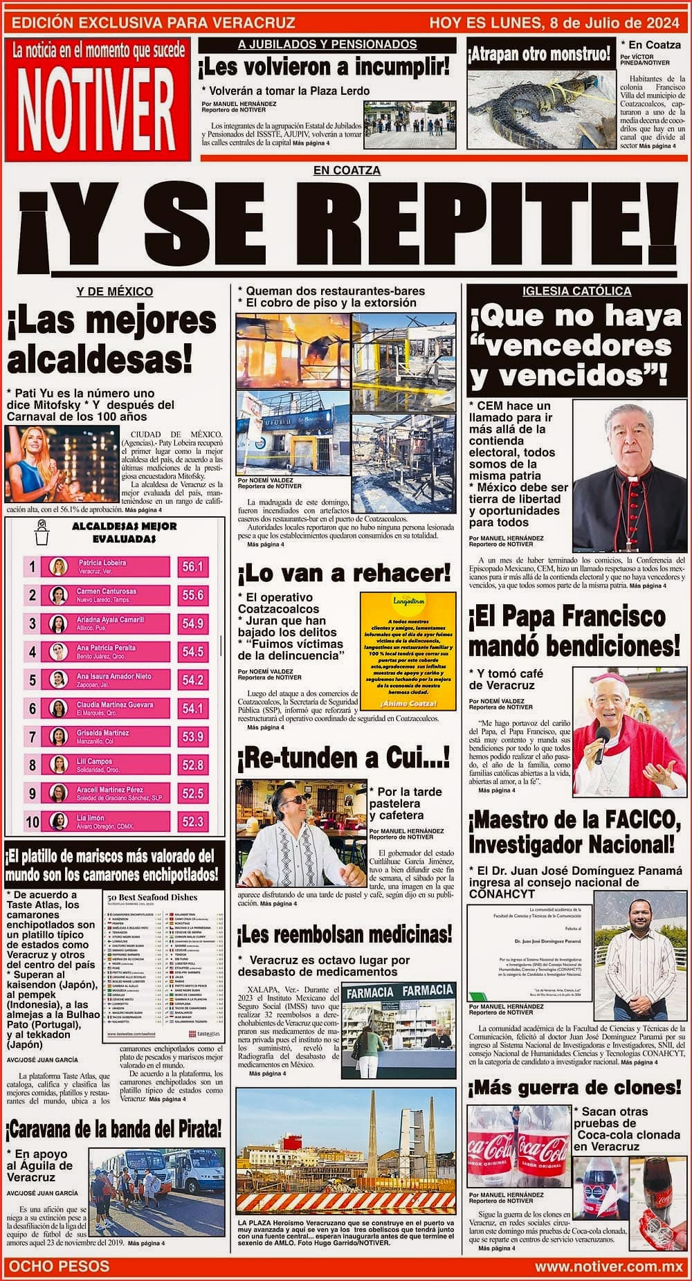 PRIMERA LA PORTADA - LUNES 8 DE JULIO 2024 EN COATZA - * QUEMAN DOS RESTAURANTES-BARES * EL COBRO DE PISO Y LA EXTORSIÓN 8 julio 2024