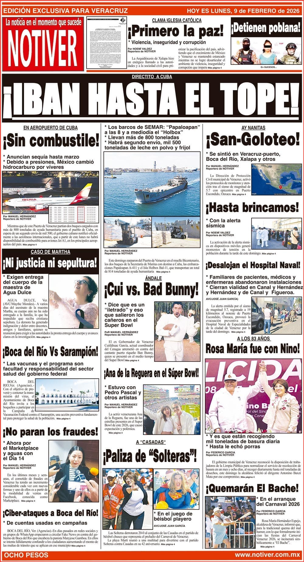 PRIMERA LA PORTADA - LUNES 9 DE FEBRERO 2026 DIRECTITO ACUBA - *LOS BARCOS DE SEMAR: “PAPALOAPAN” A LAS 8 Y A MEDIODÍA EL “HOLBOX” *LLEVAN MÁS DE 800 TONELADAS *HABRÁ SEGUNDO ENVÍO, MIL 500 TONELADAS DE LECHE EN POLVO Y FRIJOL 9 febrero 2026